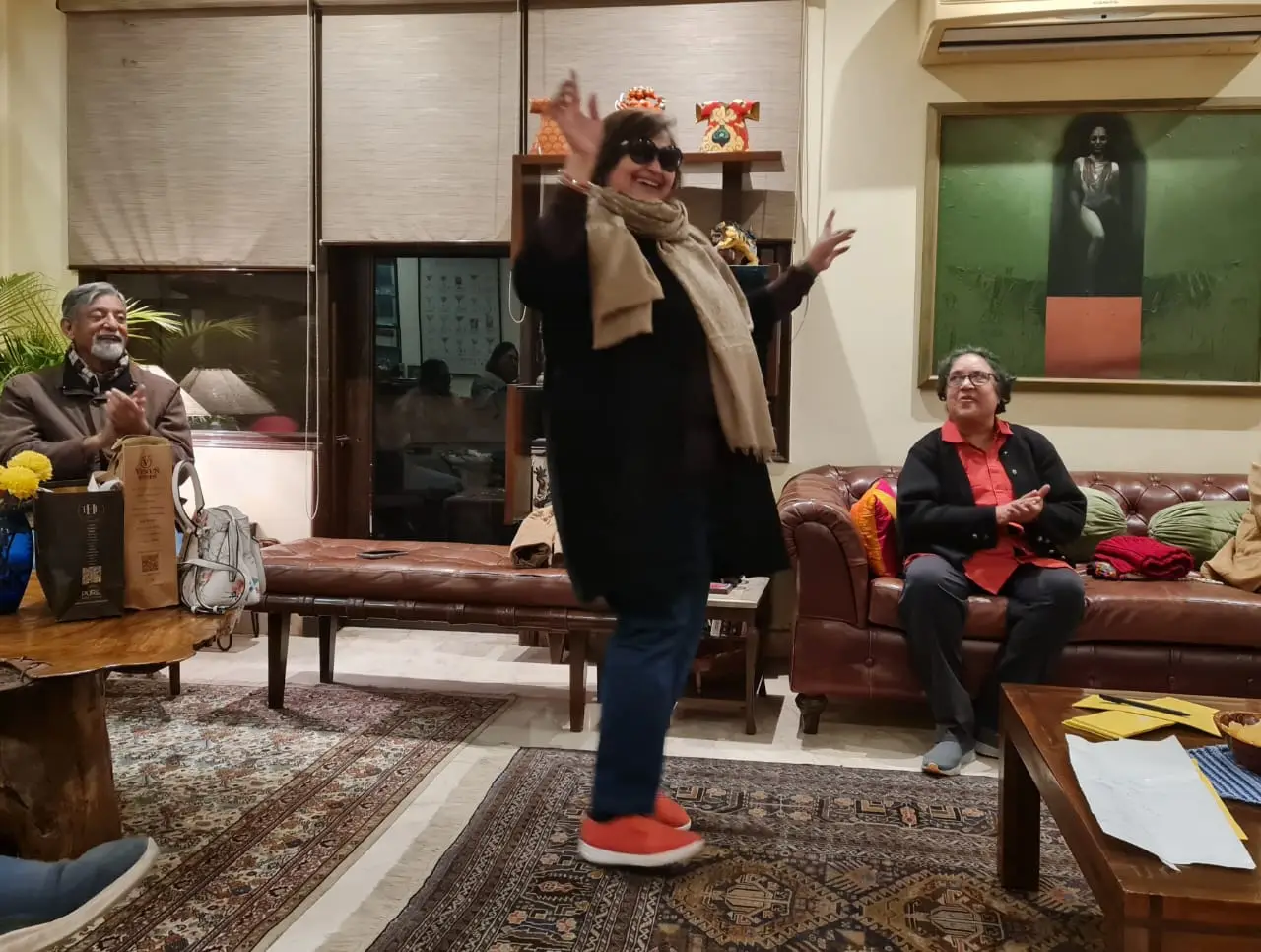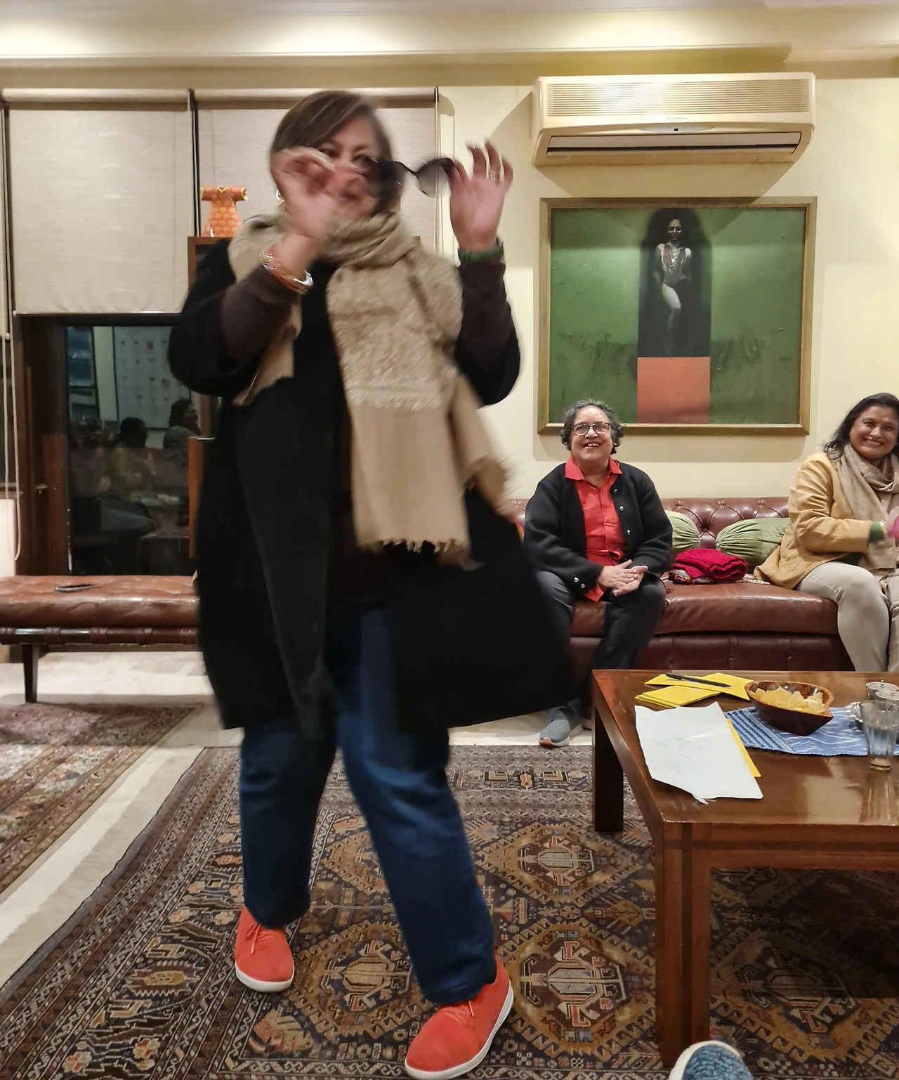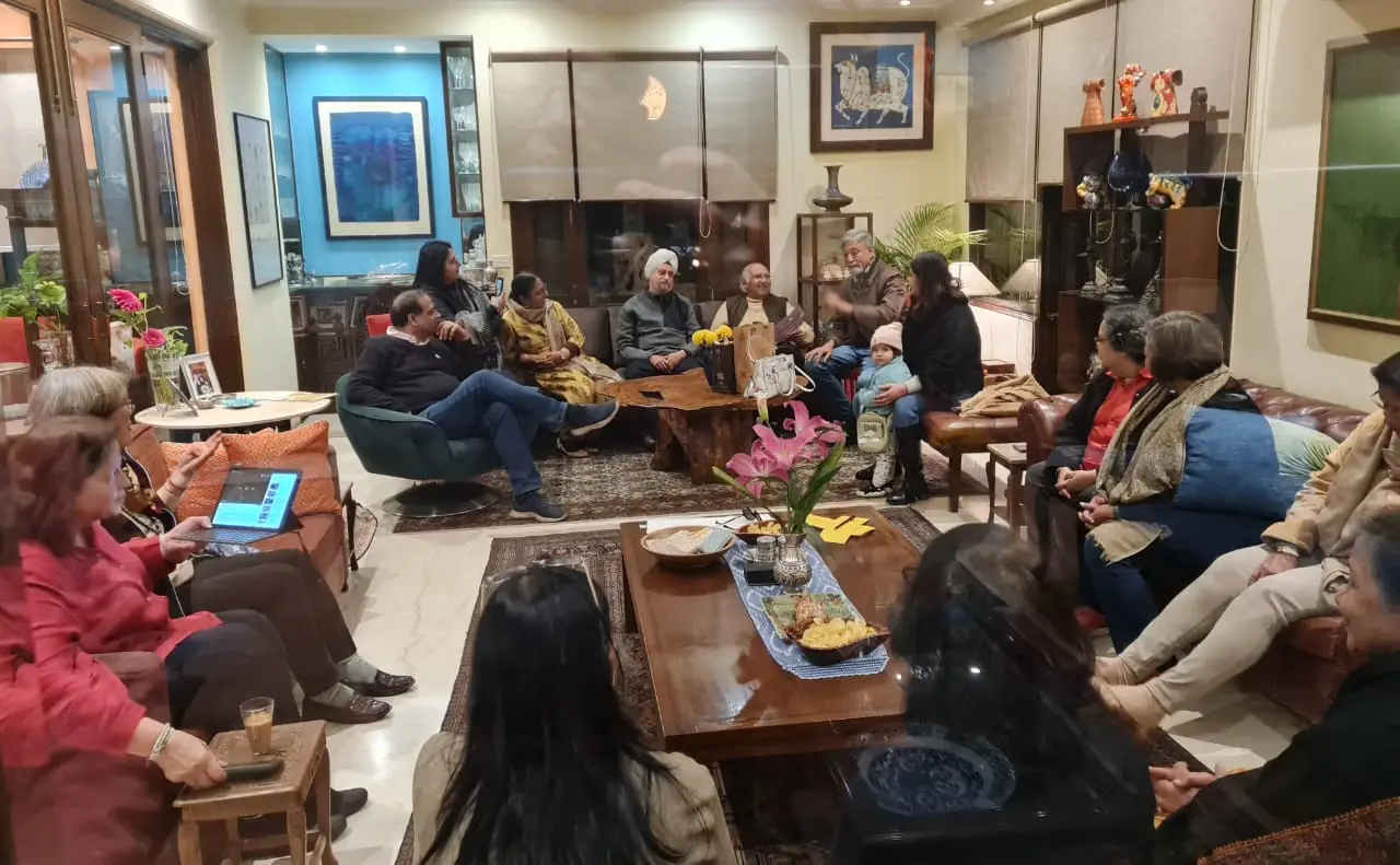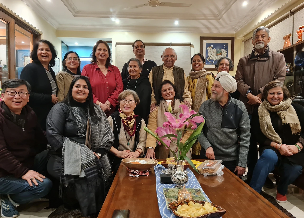자그미트 내외가 우리를 픽업하러 왔고 비산트 비하르 A블럭의 산자나네 집은 작은 박물관을 방불케 한다. 입구부터 소똥을 바른 벽에는 유리를 박아서 장식을 하였고 박물관에서보던 그림과 조각들이 벽과 집안 곳곳을 장식하고 있었다. 하지만 어수선하지 않고 품위있게 제자리를 차지하고 있는 것이 무척 어울렸다. 집도 아주 넓어서 18명이나 되는 인원이 한 곳에 모여도 비좁지가 않았다. 일하는 사람도 세명이나 되어 물과 짜이를 계속 서빙하고 있었다.