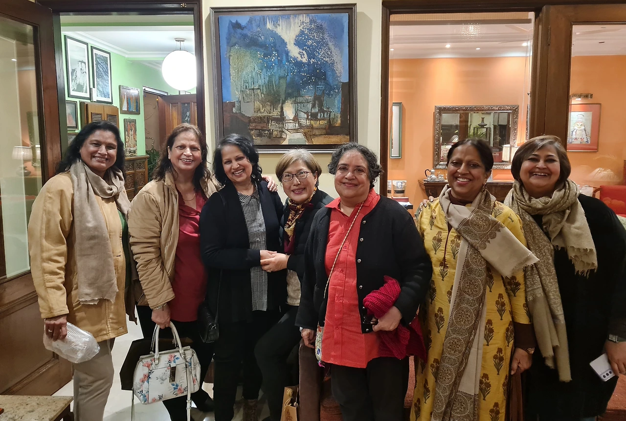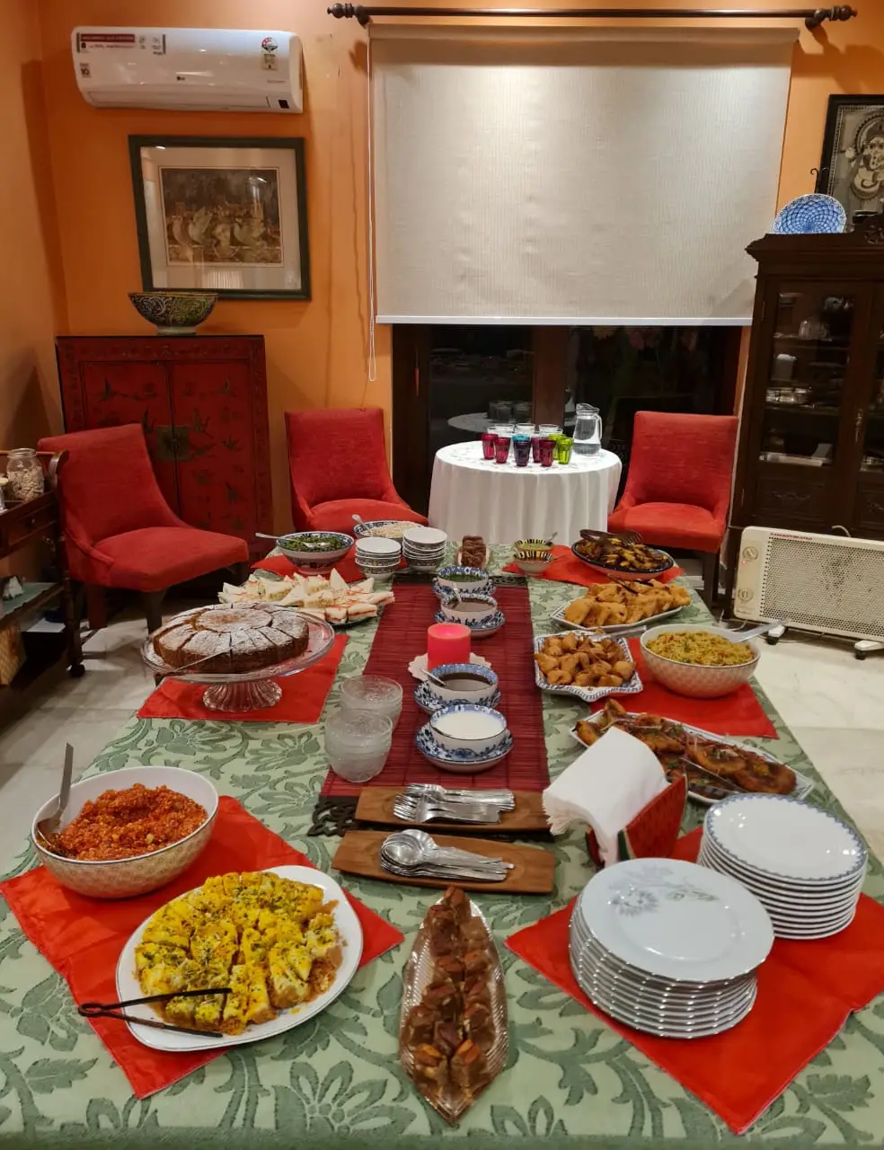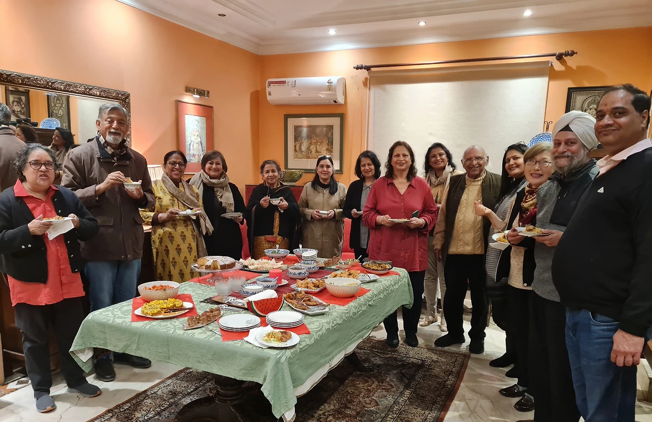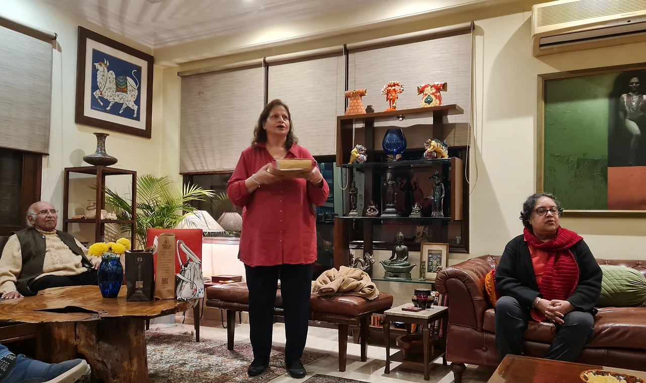 자그미트 내외가 우리를 픽업하러 왔고 비산트 비하르 A블럭의 산자나네 집은 작은 박물관을 방불케 한다. 입구부터 소똥을 바른 벽에는 유리를 박아서 장식을 하였고 박물관에서보던 그림과 조각들이 벽과 집안 곳곳을 장식하고 있었다. 하지만 어수선하지 않고 품위있게 제자리를 차지하고 있는 것이 무척 어울렸다. 집도 아주 넓어서 18명이나 되는 인원이 한 곳에 모여도 비좁지가 않았다. 일하는 사람도 세명이나 되어 물과 짜이를 계속 서빙하고 있었다.