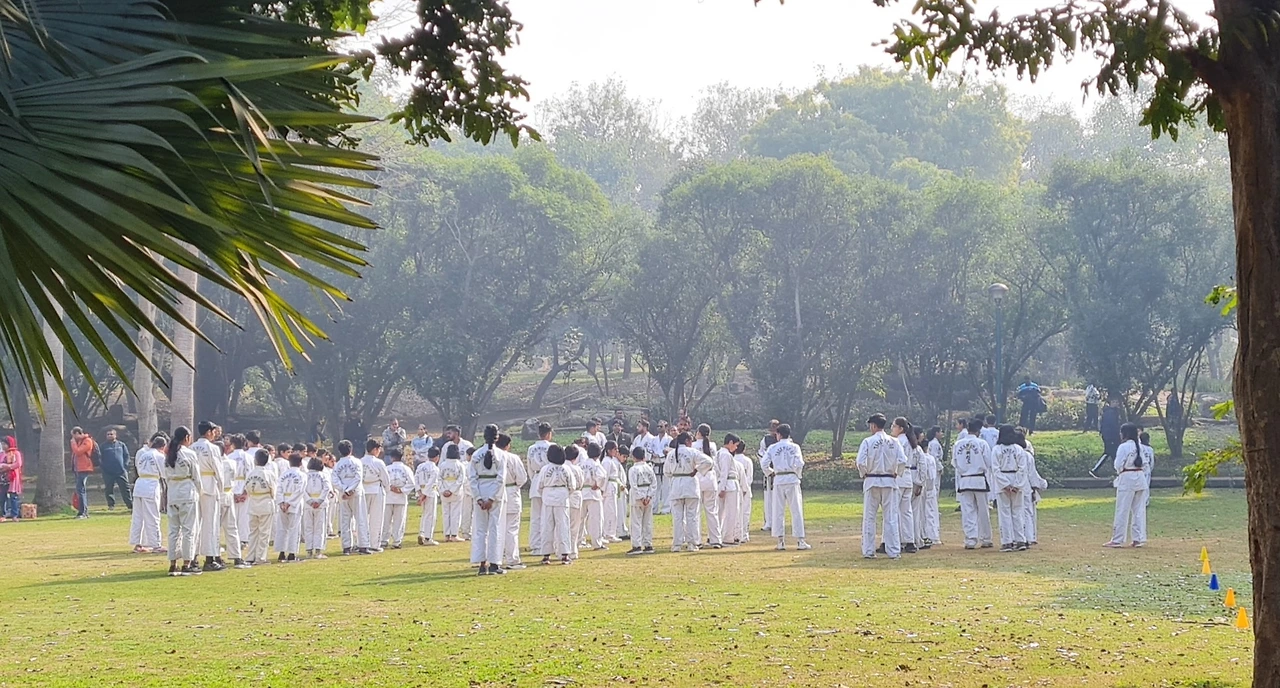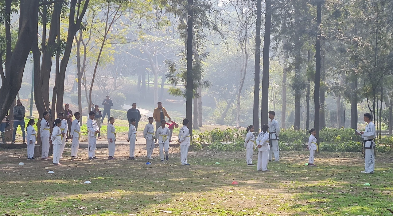 푸르른 2월의 네루공원에서는 대단위 태권도 승급심사가 이루어지는지 학생들과 부모들이 계속 들어오고 있었다.