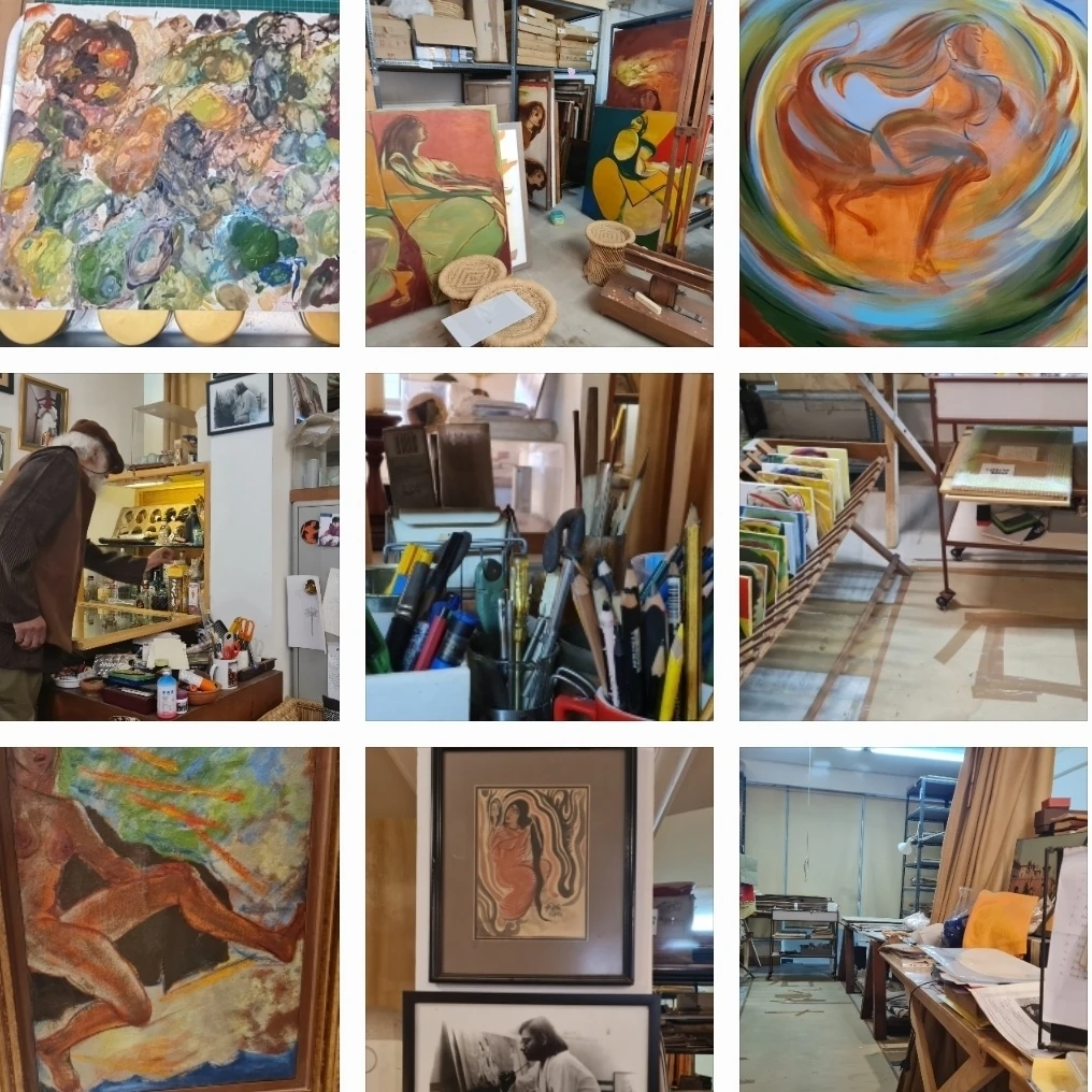 그의 백엔드 오피스엔 상주 직권이 네명 있었습니다. 완전히 소기업입니다. 작업실과 사무실, 빼곡히 쌓여있는 작품 창고 그리고 전시회 카탈로그와 국내와 해외 방문 화집 등 일정별로 모아둔 화일들이 2개층 서재와 화실에 가득합니다.