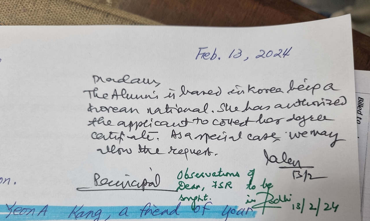 학장실 찾아 가서 서류 내밀고 잠시 기다리니까 학장이 델리대 본부에서 확인을 하라고 메시지를 써 줍니다. 당일 졸업장 받기는 난망한 것이지요...