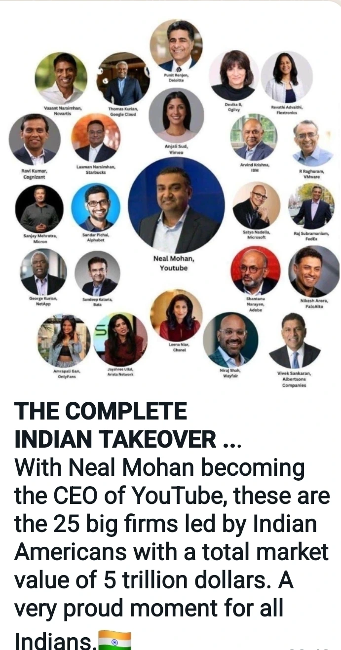 미국 다국적기업 25개사 CEO가 인도계입니다. 이들 회사들의 시장 가치가 5조달러라고 합니다. 우리 돈으로 얼추 6500조입니다. 얼마나 큰 액수인지 상대적으로 비교해보면 2022년 기준, 대한민국 총생산액이 2150조입니다 (대한민국 일년 총예산이 700조가 안될겁니다).