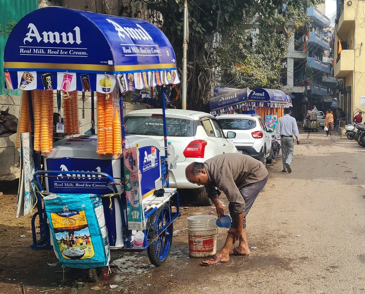 주택가 입구에 아물 아이스크림 카트들이 쭉 이어져 있습니다. 아침 영업 출근 위해서 세차하고 있습니다.