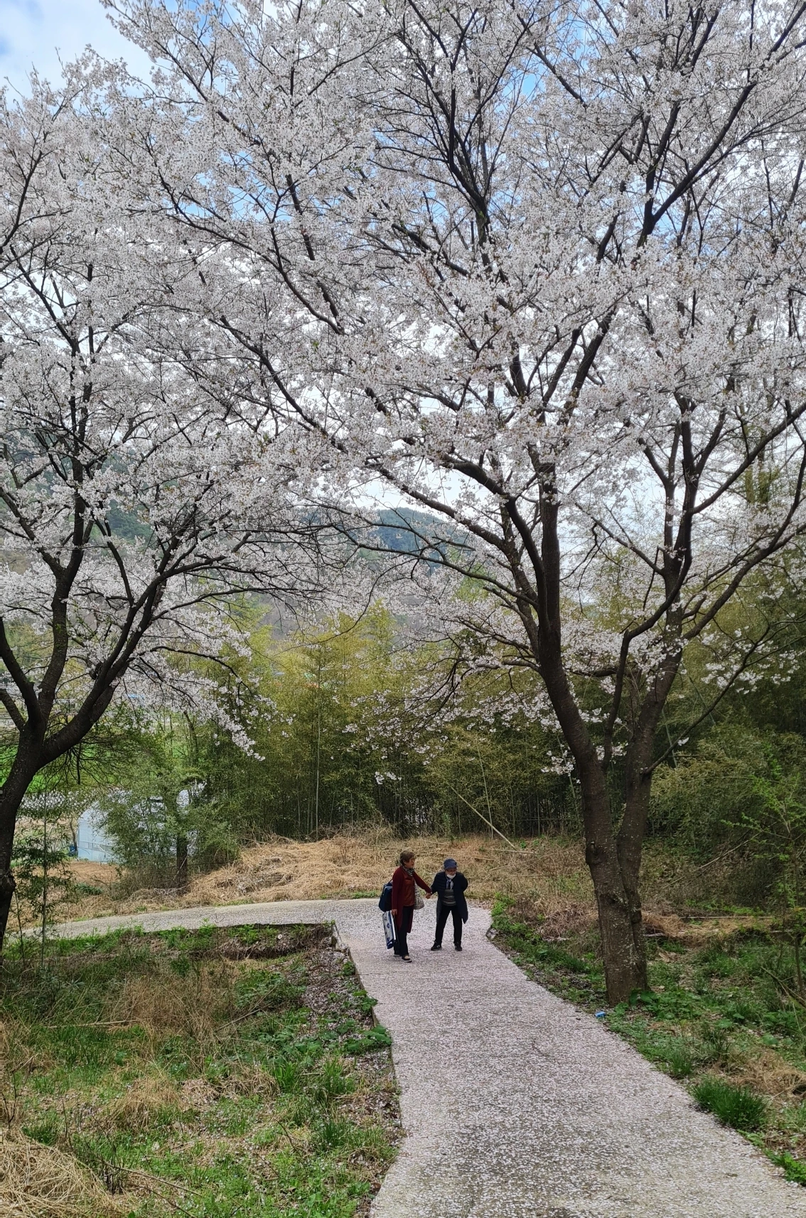 경남 의령의 강씨고가! 돌아가신 아버지가 자리 잡으신 곳에 오랫만에 어머니와 같이 올라갔습니다. 사람의 발길에 닿지 않는 오르막길은 연한 분홍색의 벚꽃잎들이 꽃길을 만들어서 저희를 맞이합니다.