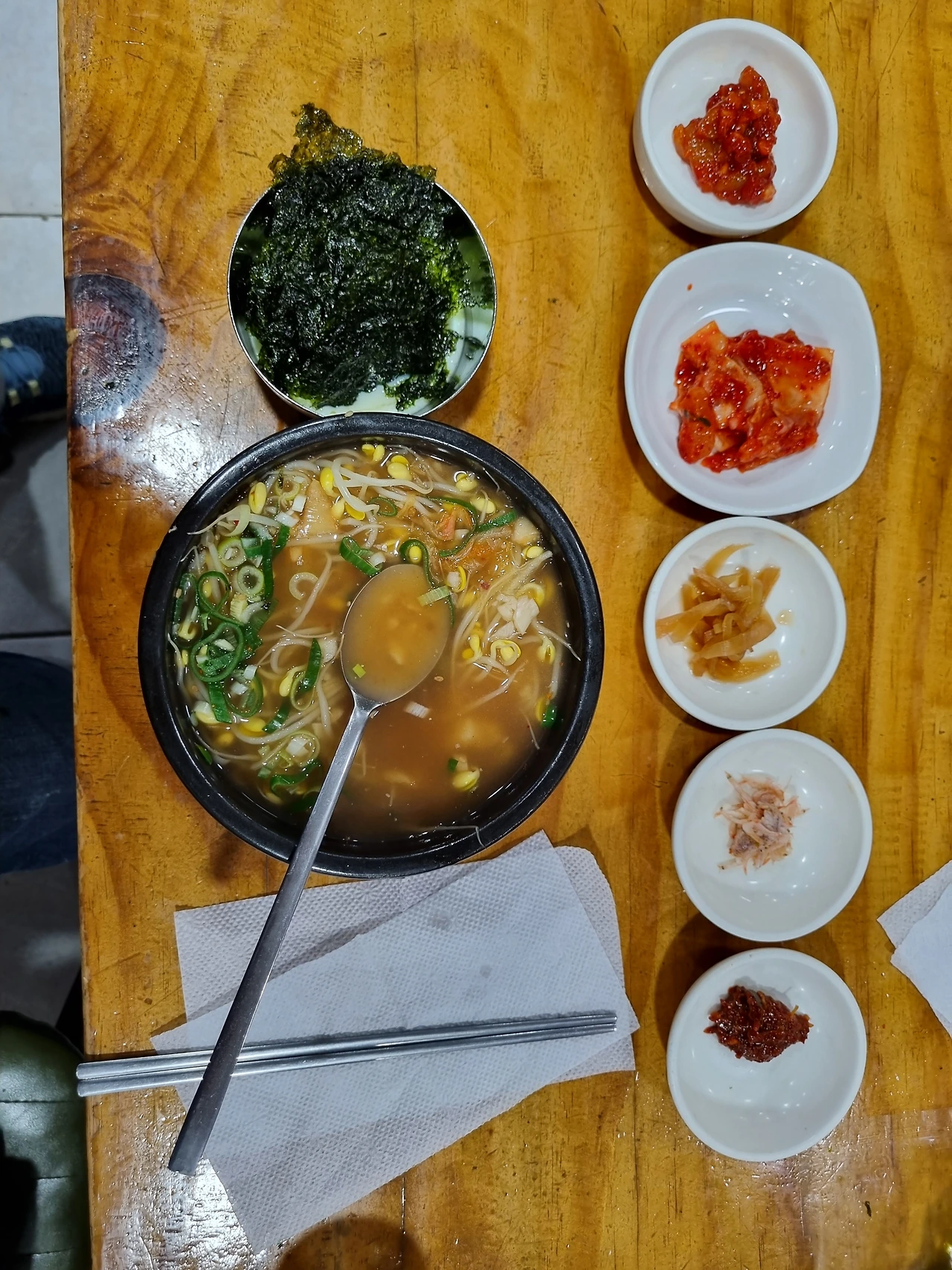 저녁으로 우리는 콩나물 국밥집을 찾아서 뒷골목 시장터를 다시 방문해서 30년 이상의 관록을 가진 전통식당에서 국밥을 먹었다. 짭조름한 젓갈이 입맛을 돗우는 콩나물 국밥은 두개의 계란이 살짝 수란으로 주어졌고 오랫만에 맛있는 계란을 먹게 되었다.