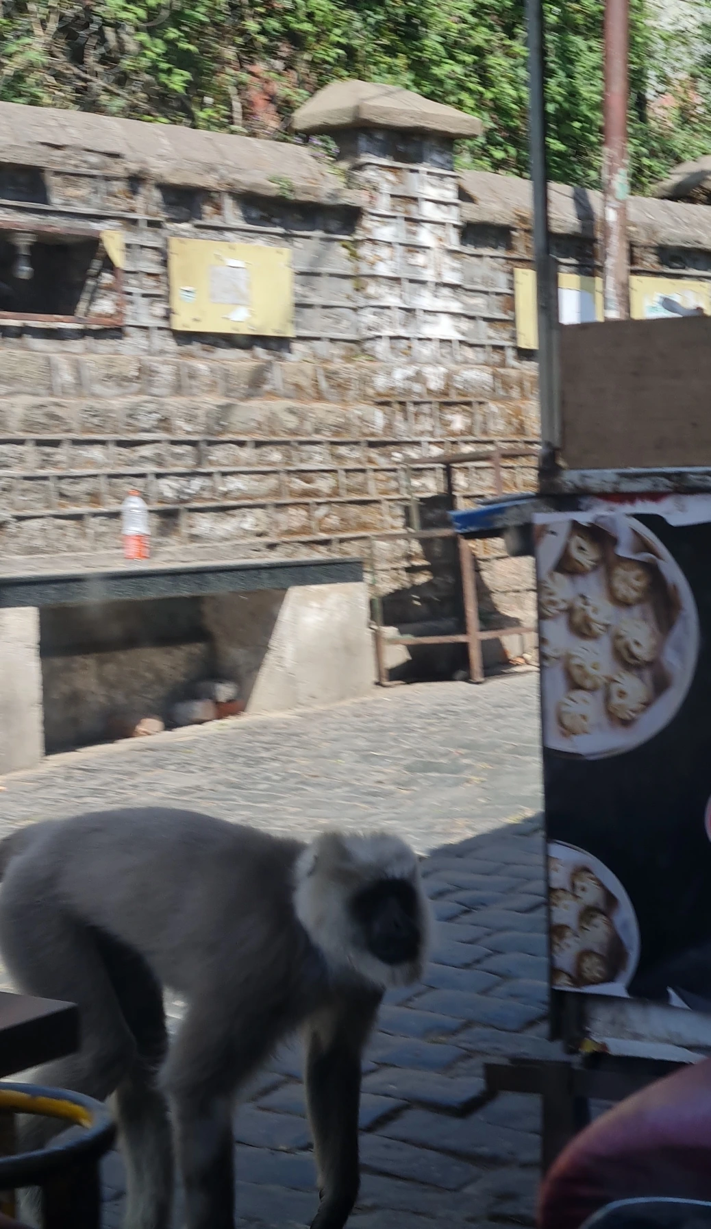 위 왼쪽 접시에 담은 사모사버거가 타겟이었습니다. 랑구르가 잽싸게 뛰어내리곤 식당입구로 진입하는 장면입니다.