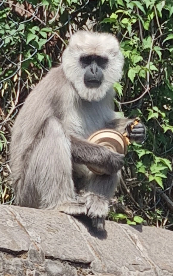 1~2초 사이에, 눈 깜짝할 새에 벌어진 일입니다. 랑구르는 안전거리인 담장위로 가볍게 올라가서는 사람처럼 두손으로 버거를 쥐고는 여유롭게 먹습니다. 큰 다행이라면, 사람은 헤꼬지 않았습니다.