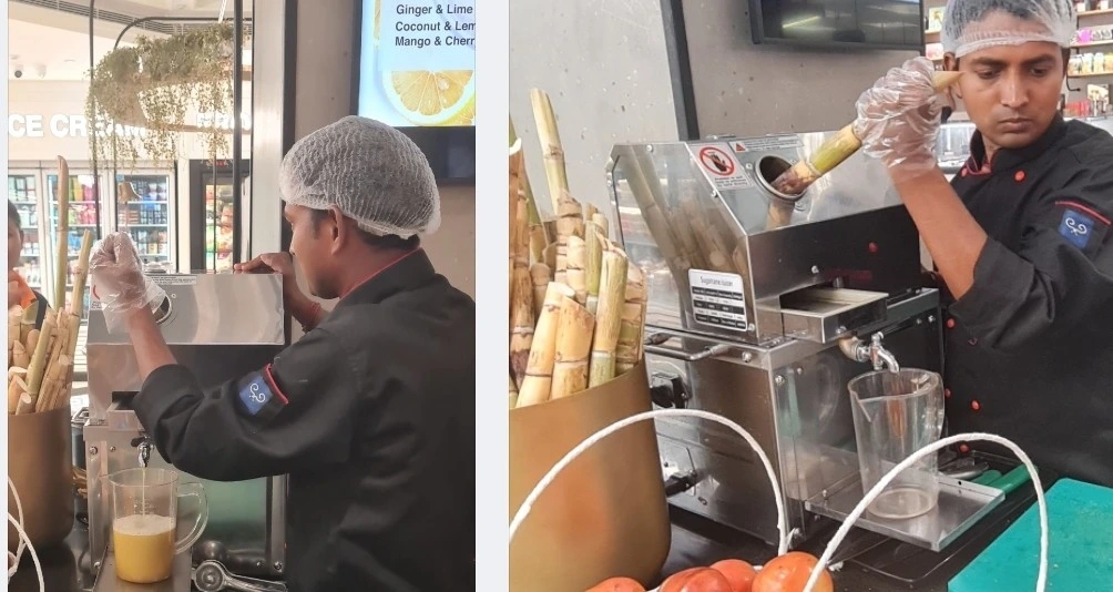 사탕수수 원액 쥬스, 한 잔 85루피입니다. 병으로도 만들어줍니다. 스타벅스에 갈 필요가 없습니다.