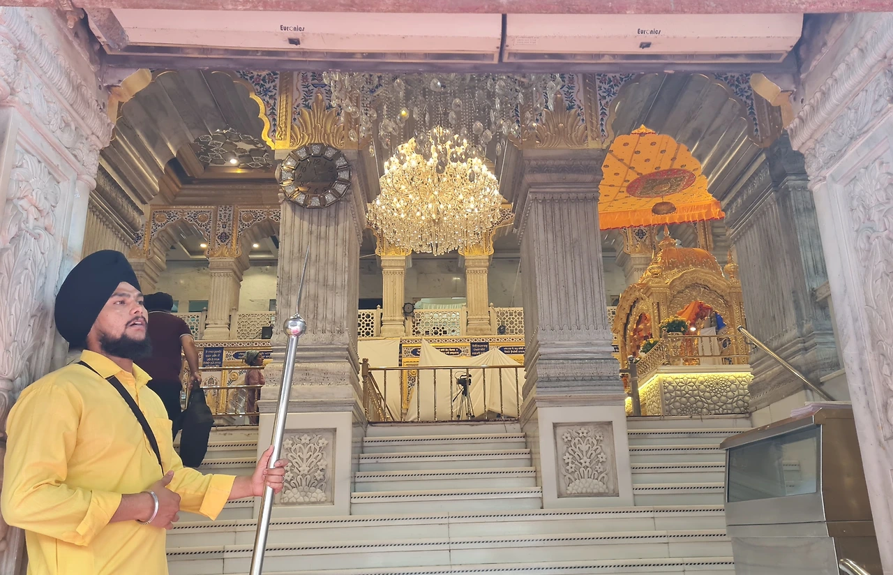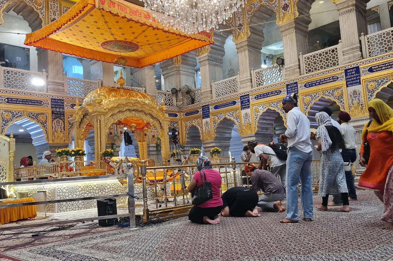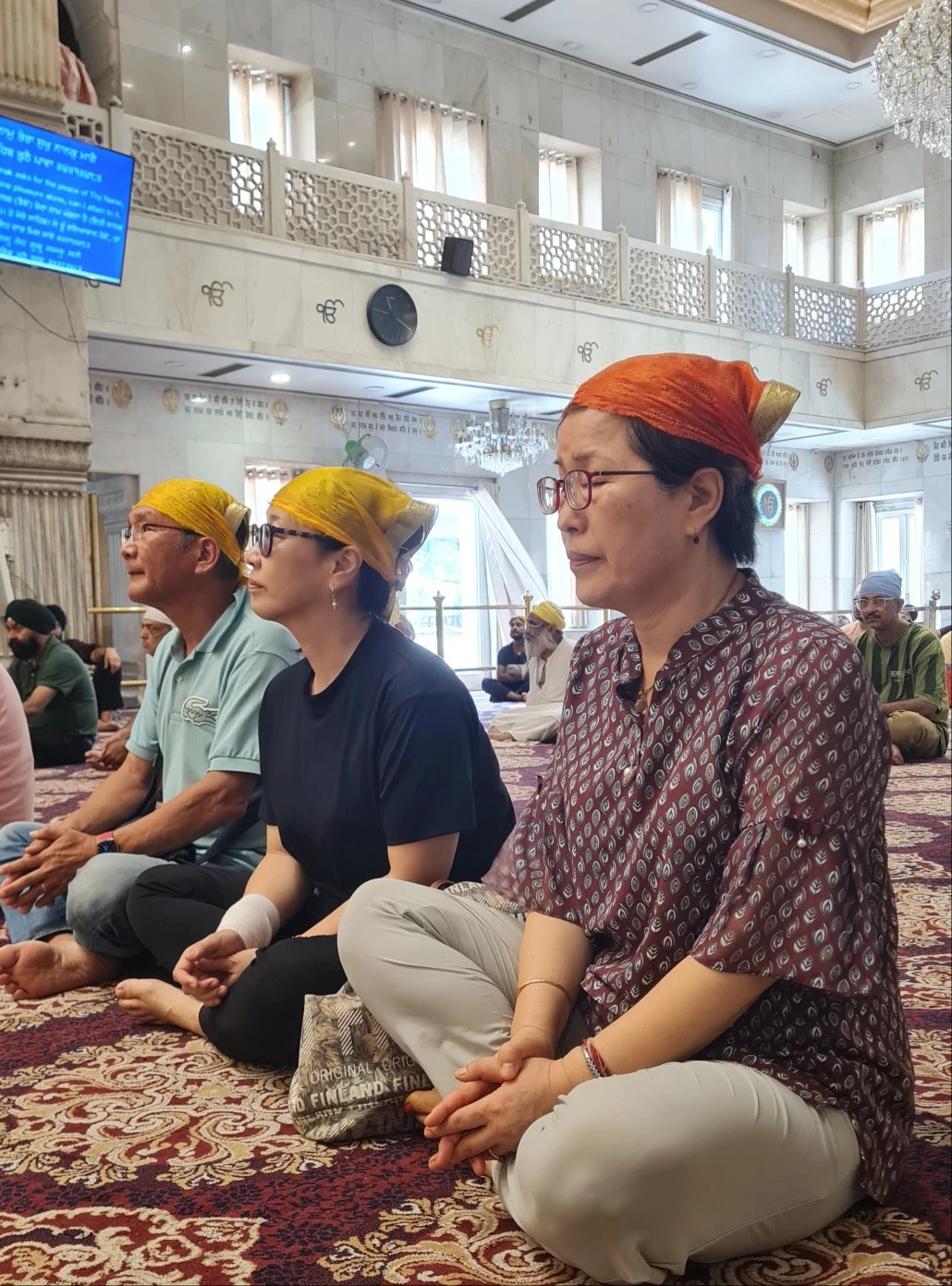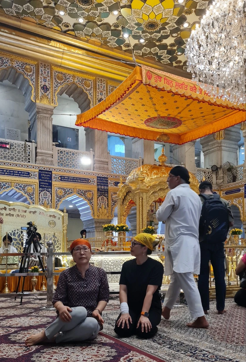 그런데 이번에 맞닥뜨린 거리는 정비가 잘 되어있고 사람들도 많이 다니지 않았다. 오전내 가랑비가 와서 그런 탓도 있었을 터... 붉고 노란 빛의 시바 사원을 지나서 하얀 대리석으로 만들어진 시크교 구루드와라... 여기는 입장하면 마음이 평안해지기에 같이 들어가보자고 했다. 외국인들이 들어가는 곳이 따로 있었고 신발을 벗어서 놓아두고 머리를 가리는 두건을 쓴 다음 조심스레 발을 닦고 신전으로 들어갔다.