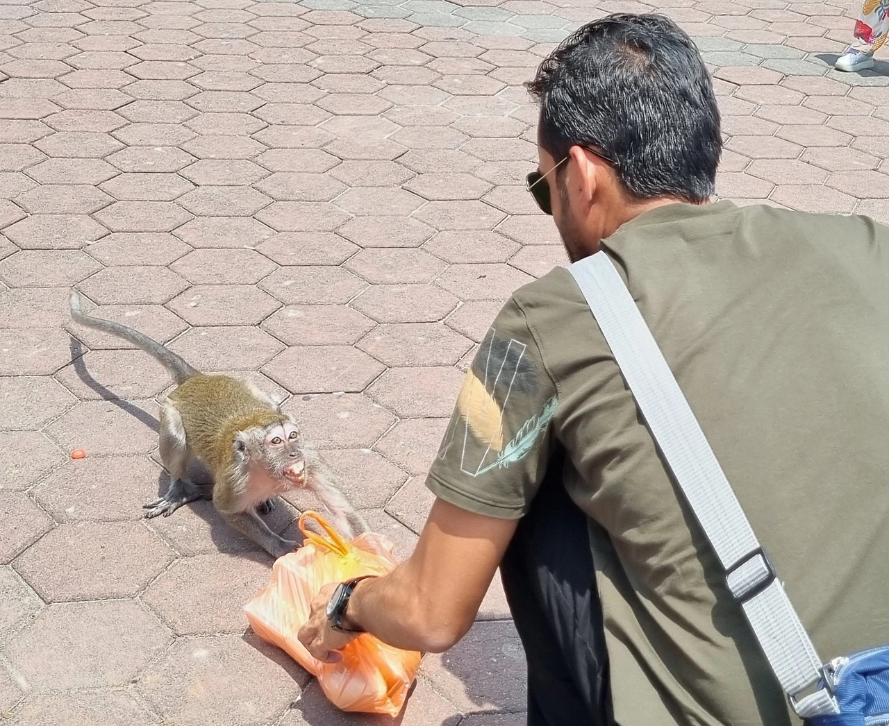 한 인도아이가 들고가던 점심먹거리를 원숭이가 낚아챘는데 아빠가 얼른 빼앗는 모습. 바로 앞에서 일어난 일인데 원숭이가 무서워 도와주지 못했다. 모자도 꽉 묶고 올라갈 정도였으니..