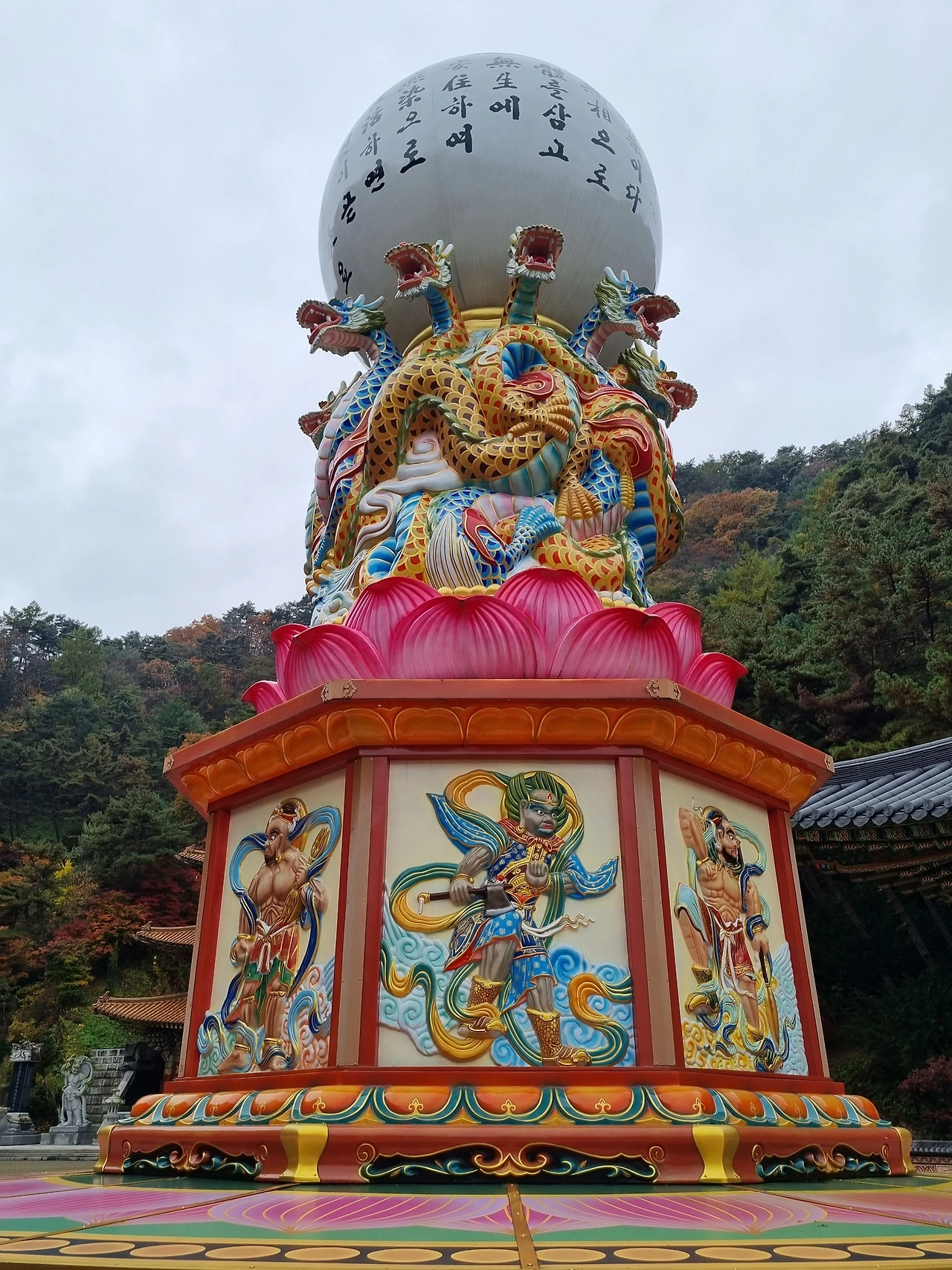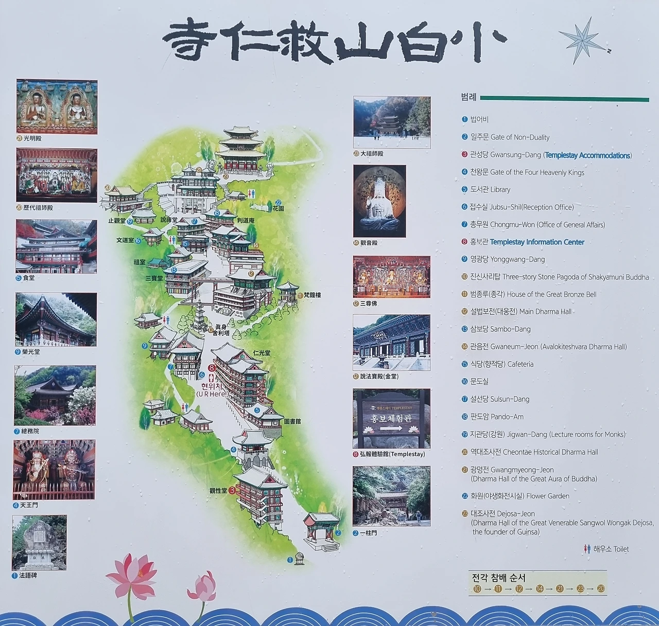 다음으로 천태종의 본산인 구인사! 주차장에서 어떤 분이 친절하게도 버스를 타고 가라고 하셔서 타고 올라왔다. 그런데 거기에서 또 한참을 올라가야지 제일 큰 본당에 나오게 되었다. 희안하게도 부처님이 아니라 천태종의 부흥을 일으킨 분을 모시는 곳이어서 의아해했던 기억이 난다. 절 건물들이 나무처럼 보였으나 거의 콘크리트로 만든 것이었고 공양을 하루에 세번 한다고 해서 놀라웠다.