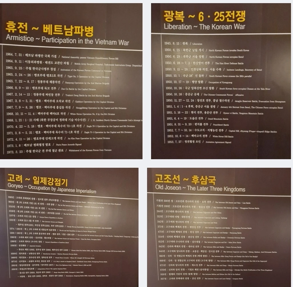 안에 들어서니 고조선부터 베트남 파병 때까지 한반도에서 치러진 전쟁역사가 보입니다. 놀라운 사실은 저희는 단 한번도 다른 나라를 넘보거나 침략했던 적이 없는 평화로운 사람들입니다.