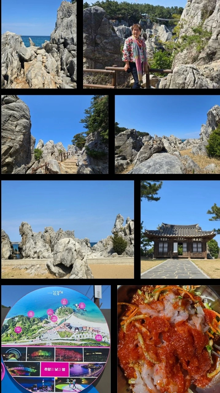 추암해변과 촛대바위는 와서 보길 정말 잘했다는 생각을 하였다. 애국가를 TV 방송할 때, 첫 장면에 나오는 것이 바로 이곳 촛대바위라고 하니!(암석 기둥, 라피에) 여러 가지 모양의 암석 기둥들이 참으로 멋지고 에메랄드 빛 바다와 어울어져 무척 아름다웠다.