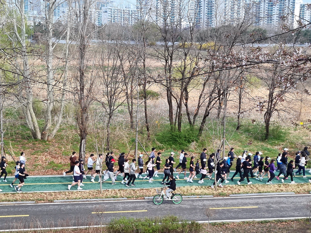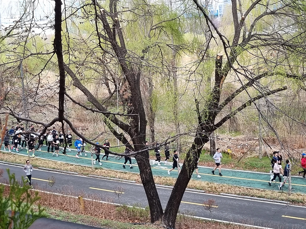 황토 걷기를 시작하고 사진을 찍으면서 인증하고 있는 데 아래쪽 트랙에서 많은 사람들이 우루루 뛰고 있는 것이 느껴졌다. 마라톤 대회가 열린 것이었다.