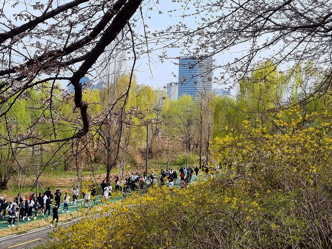 서울의 젊은이들은 다 모인듯이 활기차고 어여쁜 모습들이 보여졌다. 슬로우 죠깅을 하는 듯 속도감은 느낄수 없었지만 한동안 아주 많은 젊은이들의 죠깅하는 모습을 볼수 있었다. 그 옆으로는 또 많은 사람들이 자전거를 타고 있었고... 어제 내린 비로 식물들이 초록초록하게 물이 올라있고 싱그러우면서 공기도 맑아졌다. 주변에 개나리와 이름모를 붉은 꽃이 한창이다, 벚꽃은 말할 필요도 없이 하얗게 하늘을 가리웠다.