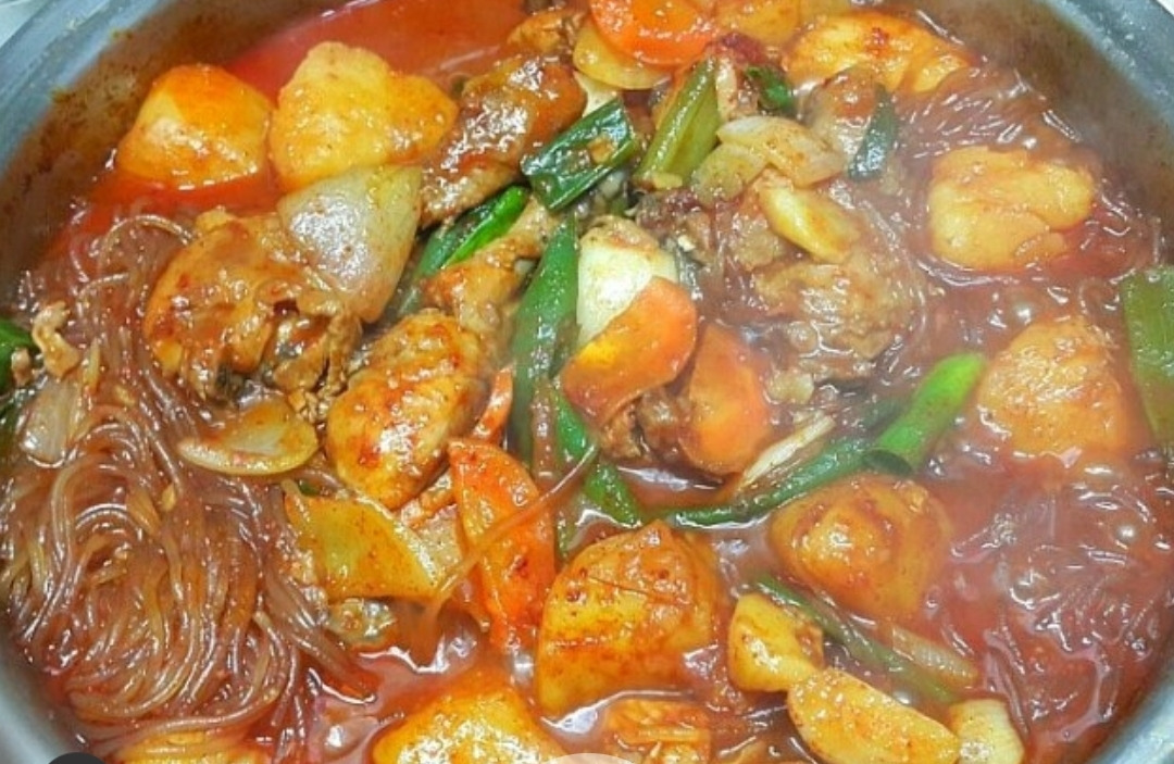 만드는 법: 1. 닭은 적당히 작은 크기로 자른 것을 깨끗이 씻어서 우유에 잽니다. 혹은 양파 간 것 반과 소금, 후추를 약간 넣어 뒤적거려 놓습니다. 개인적으로 양파와 후추, 소금으로 잡내 잡는 것을 선호합니다. 당면은 미지근한 물에 미리 불려놓으세요. 2. 참기름 빼고 위의 양념장을 분량만큼 냄비에 만들어 놓습니다. 3. 양념장이 든 냄비에 물 600ml를 넣고 한소끔 끓여 줍니다. 물 대신 육수를 넣어주시면 좀 더 감칠맛이 나겠지요? 전 그냥 다시마 한, 두장을 넣어줍니다. 4. 야채 손질 중 감자는 모서리를 깎아서 놓습니다. 다른 야채는 한입 크기로 썰어 놓습니다. 5. 육수가 끓으면 재어놓은 닭을 씻어서 집어넣습니다. 한소끔 끓을 때 감자를 넣어 뚜껑을 덮고 중불에 25분 정도 끓여 주세요. 6. 어느 정도 닭과 감자가 익었으면 나머지 야채를 집어넣습니다. 간도 보고 부족한 것 있으면 더 추가하고 짜거나 매우면 물이나 육수를 더 추가합니다. 7. 불려놓은 당면을 집어넣어서 푹 퍼질 때까지 중불에서 끓입니다. 혹시 국물을 선호하는 분들은 미리 당면을 삶아서 넣으면 국물이 많이 줄어들지 않습니다. 없거나 당면을 선호하지 않으면 안 넣어도 괜찮습니다. 8. 신의 한 수인데 참기름을 나중에 몇 방울 떨어뜨리면 감칠맛이 납니다. 후추 좋아하시는 분들은 후추를 추가합니다. 9. 닭과 당면, 야채를 거의 먹었을 때 밥 한, 두 공기와 김치 잘게 썰은 것, 김가루, 참기름을 투하해서 비벼먹으면 아주 든든하고 맛있는 식사를 하게 되어 만족감이 업, 행복감이 업! 됩니다.