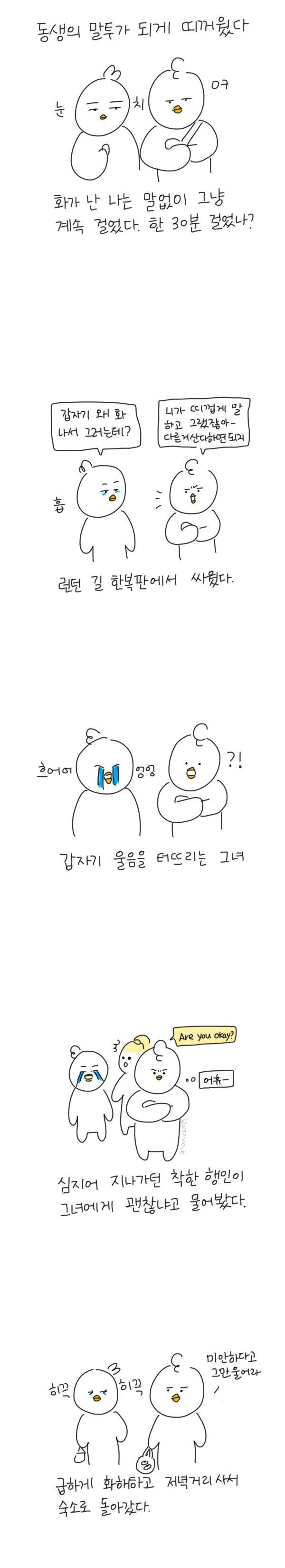 전지적 언니 시점에서 동생과 싸웠을 때만 빼면.. 싸워서 동생이 울고 있을 때 사람들이 괜찮냐고 물어봐주고, 랜덤 장난감 사려고 보고 있었는데 직원이 다가와서 안에 뭐 있는지 자기가 다 알고 있다며 비밀스럽게(?) 알려주고,