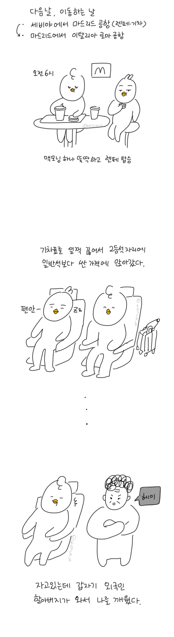 다음날 아침엔 이탈리아로 가기 위해 세비야에서 마드리드 공항까지 가는 렌페를 탔다. 운 좋게 2등석에 앉아서 가게 되었고 도착하려면 몇 시간이 걸리는 거리라 자고 있는데, 갑자기 외국인 할아버지가 화난 얼굴로 나를 깨웠다.