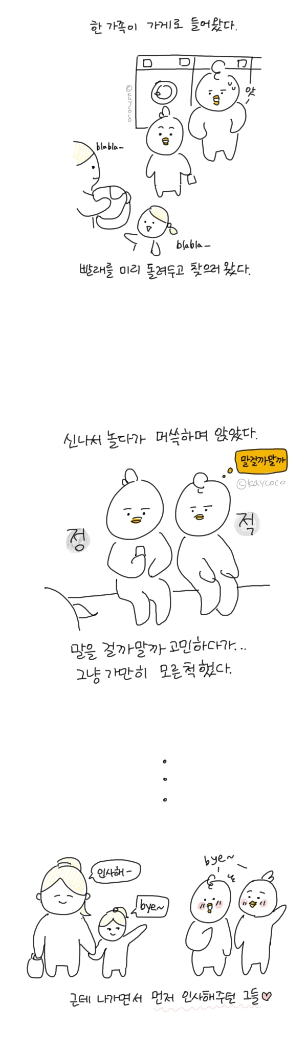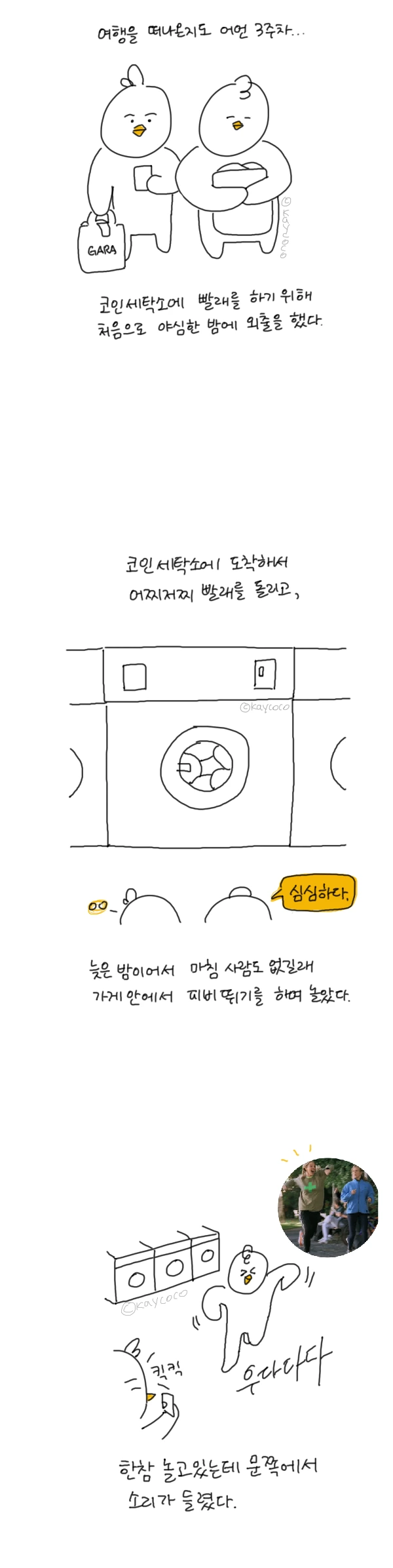 코인 세탁소에 가서 빨래를 돌리고, 기다리다가 심심해서 아무도 없는 가게 안에서 주접을 떨면서 놀고 있었는데 갑자기 한 가족이 코인 세탁소에 들어왔다.