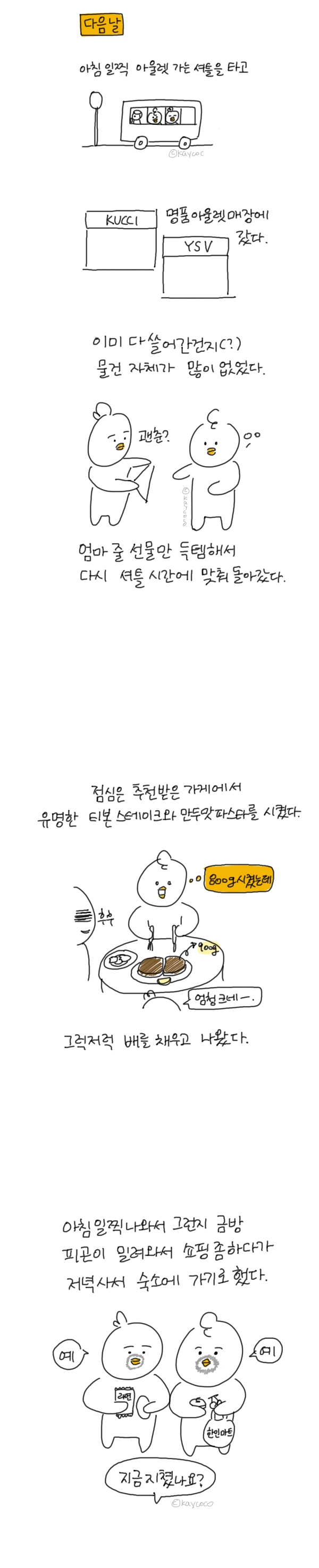 아무튼 둘러보다가 엄마 선물로 괜찮은 게 있길래 사고, 이곳저곳 구경하다가 점심때쯤 다시 셔틀을 타고 돌아갔다.