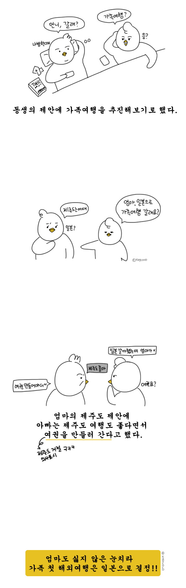 엄마에게 일본 이야기를 먼저 꺼내자 처음 가는 해외라 마음이 약간 그랬는지 제주도를 제안했는데 나도 동생도 아빠도 미적지근한 반응이었다. 아빠가 제주도도 좋은데 여권 만들러 간다는 말을 하며 신난 몸짓을 했다. 엄마는 어이없다는 듯 깔깔 웃으며 일본으로 가자고 했다.