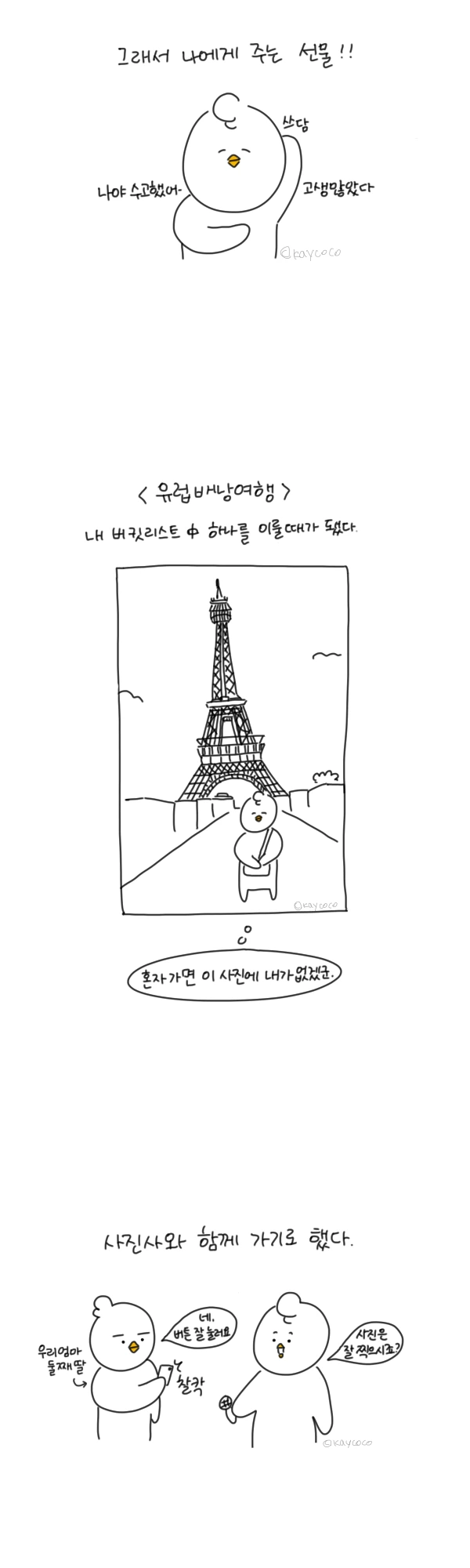 한 달 유럽여행을 가기로 결정하고부터 혼자 가야 할지 고민이었다. 요즘은 ‘혼여(혼자 하는 여행)’의 모습을 많이 볼 수 있고 새로운 사람들 만나는 걸 좋아하니 처음에는 혼자 가려고 했다. 그런데 혼자 여행을 간다고 생각한 순간부터 ‘혼자 여행 간 사람들의 후기'에서 남는 건 위험한 순간뿐이었다. 이 위험한 순간들이 다 미래의 내 일이 된 것 같았다. 그렇게 걱정병이 도져서 “그래! 사진사가 없어 사진사가. 핸드폰이나 귀중품이 그렇게 잘 없어진다는데 여행 동반자는 꼭 있어야지.”하며 동생을 데리고 간다.