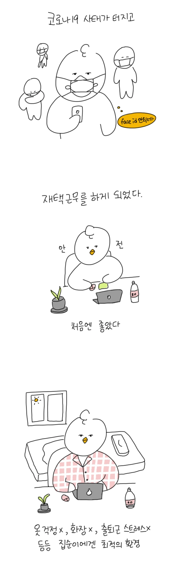 업무 환경과 집이 분리되지 않으니 집에 있어도 뭔가 불편함이 가득한 기분이다.