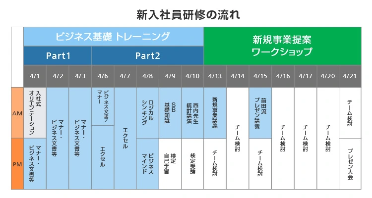 2020년도 신입사원 교육은 크게 '비즈니스 기초 트레이닝', '신규사업 제안 워크숍'이라는 두 가지로 나누어졌다. '비즈니스 기초 트레이닝'은 비즈니스 문서, 매너, 엑셀 등 사회인으로서의 기본적인 스킬을 주입하는 것을 목적으로 삼고 있다. 주로 동영상이나 웹 회의 시스템을 이용하여 라이브 강의를 실시했지만, 아직 한 번도 회사에 와본 적이 없는 신입사원들에게 자택에서 원격 교육이 가능한 환경을 준비하는 것도 쉽지 않았다.