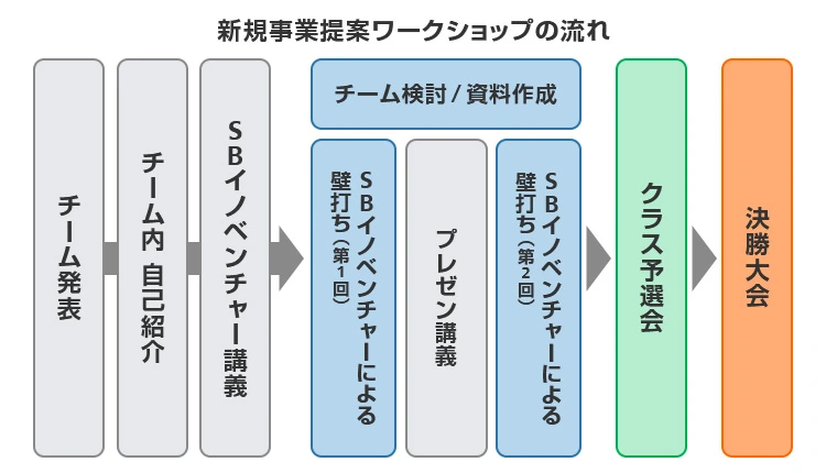 약 1주일 간의 프로그램이었던 '신규사업 제안 워크숍'에서는 소프트뱅크의 사내 창업 제도인 '소프트뱅크 이노벤쳐'의 멤버가 신규사업 개발에 대한 강의를 진행하고, 4명~5명의 팀으로 나누어져 토론을 이어갔다. 각 팀은 토론을 통해 신규사업의 내용을 정하고, 자료를 작성했다. 그리고 최종 프레젠테이션을 향한 준비를 진행했다. 이 모든 과정을 신입사원 약 600명이 동시에 참가한 Zoom 회의로 진행했다.