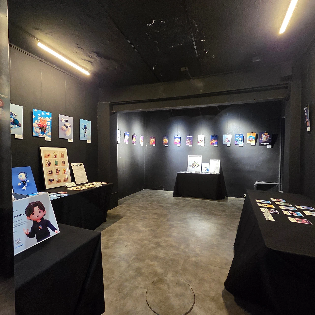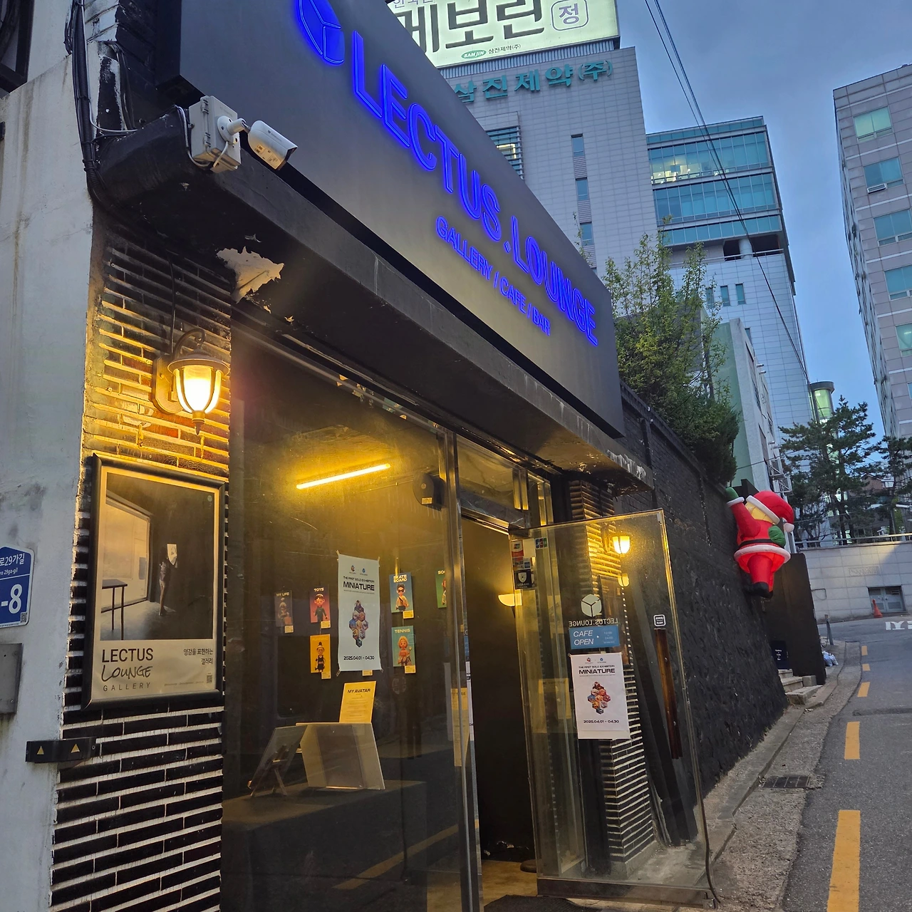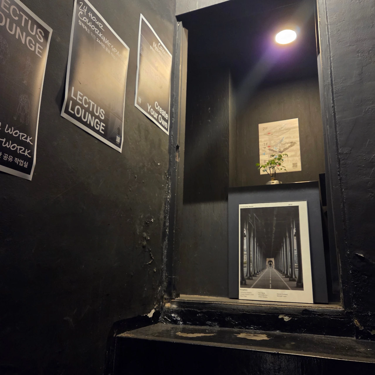 렉터스라운지는 입구부터가 힙하다. 문에 들어섰는데, 주문하는 곳이 보이지 않는다. 와! 이것 또한 새로운 발상이다. 사방이 검은 벽지에 포인트 그림과 엽서로 입구를 맞이한다.