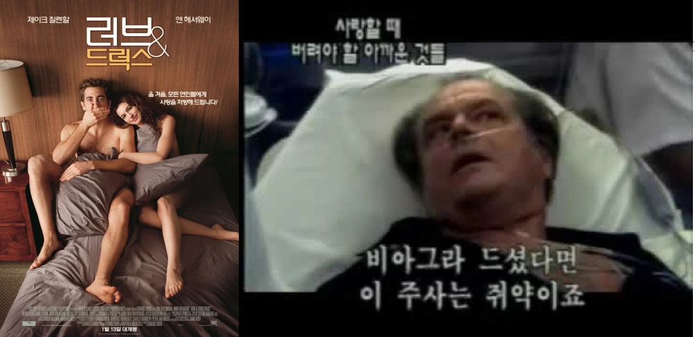 '사랑할 때 버려야 할 아까운 것들'에서 협심증으로 응급실에 실려간 해리(잭 니콜슨). 의사는 치료제를 투여하기 전에 비아그라 복용 여부를 묻고, 해리는 거짓말하며 부정한다. 애인이 듣고 있기 때문이다. 비아그라를 복용한 사람은 협심증 치료제인 니트로글리세린이 금기다. 이런 질산염 제제는 혈관을 확장시켜 심장으로 가는 혈액과 산소 공급을 증가시키는데, 비아그라는 이 효과를 강화시켜 혈압이 과도하게 저하될 수 있기 때문이다. 의사가 다행이라면서 니트로글리세린을 막 투여하는 와중에 설명을 듣고 질겁하는 해리.