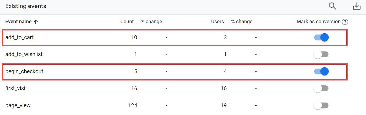 GA4에서는 user_engagement라는 이벤트가 생겼습니다. 고객이 방문 후 참여했다고 판별하는 기준을 3가지로 말씀드렸습니다. 참여(Engagement) 이벤트는 웹사이트나 앱에 접속한 지 10초가 지났거나 페이지 조회수가 2회 이상이거나 전환 이벤트가 1회 이상일 때 이벤트가 카운팅됩니다. GA4에서는 전환 이벤트를 세팅하는 방법이 UA와 조금 다릅니다. GA4는 ‘목표(전환)’ 기능이 별도로 존재하지 않기 때문에, 기존에 수집된 이벤트 중 전환(Conversion)으로 관리하고 싶은 이벤트의 토글을 활성화해서 전환으로 관리합니다. 이를테면 add_to_cart 이벤트를 전환으로 측정하고 싶으면 Mark as conversion 탭에서 토글을 파란색으로 활성화시키면 됩니다.