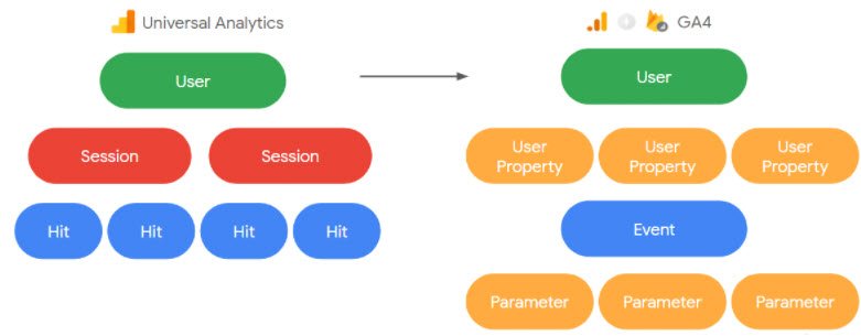 정리하면 GA4에서는 '세션'이라는 지표가 존재하지만 좀 더 사용자 관점에서 데이터를 바라볼 수 있게 바뀌었고, 사용자는 각각의 사용자를 특정할 수 있는 사용자 속성이 존재하며, 사용자가 발생시키는 모든 액션은 이벤트 및 매개변수로 수집됩니다.