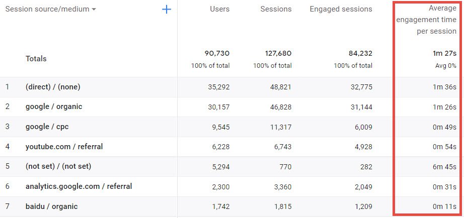 체류 시간에도 변화가 생겼습니다. UA에서는 마지막 페이지에서 머무른 시간은 세션 시간에 포함하지 않아 체류시간을 있는 그대로 해석하기 애매했습니다. GA4에서는 사용자가 세션을 종료하기 직전 페이지 또는 앱 화면에 체류하는 동안에도 user_engagement 이벤트가 체류한 시간을 수집합니다. 만약 사용자가 브라우저 탭을 여러 개 띄워놓고, 다른 탭을 클릭해서 활동하는 동안에는 체류 시간에 포함하지 않아요. 따라서 체류 시간을 이전 대비 정확하게 측정할 수 있고, 해당 데이터는 획득보고서에서 Average engagement time per session이라는 지표를 통해 확인할 수 있습니다.