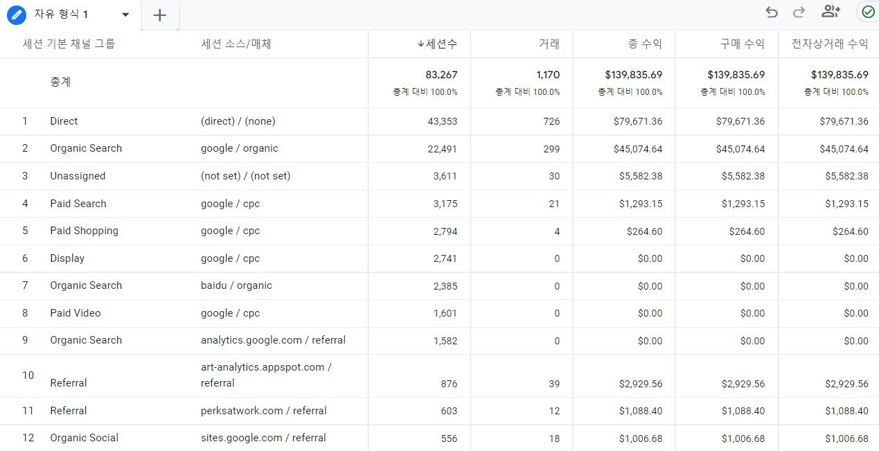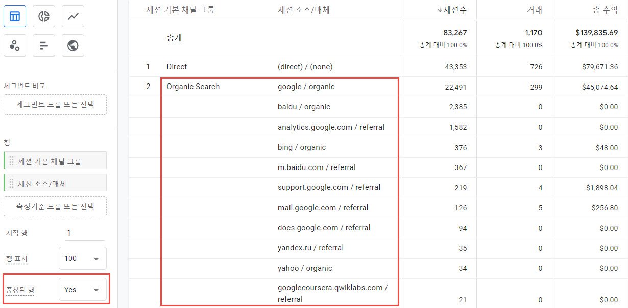 아래 보고서에는 '세션 기본 채널 그룹'과 '세션 소스/매체' 이렇게 2개의 측정기준이 적용되어 있습니다. 내림차순 정렬을 하려면 원하는 지표를 클릭할 경우 자동 내림차순 정렬이 됩니다. 단, 세그먼트가 적용된 열에서는 적용되지 않고, 전체 데이터가 적용된 열에서는 작동하니 참고하세요. 아래 테이블에서 Organic Search 채널의 세션 소스/매체만 묶어서 보고 싶다면 어떻게 해야 할까요?