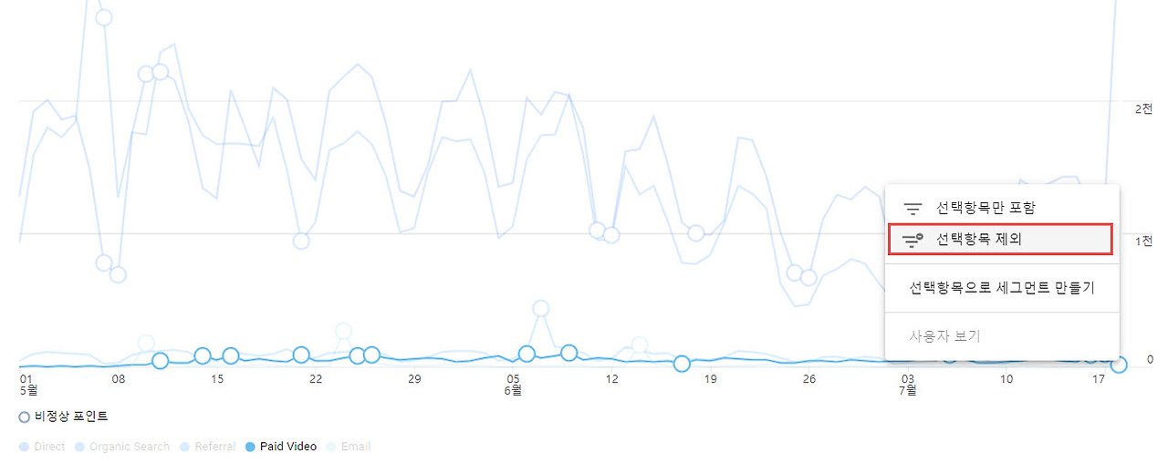UA를 떠올렸을 때 맞춤 보고서에서 특정 채널을 제외하고 싶다면 필터를 걸어서 제외를 하거나, 캠페인 보고서에서 'not set' 항목을 제외하고 보고 싶다면 역시 필터를 통해 이를 제외하는 세팅이 필요했습니다. GA4에서도 동일한 방식으로 필터를 적용해도 되지만, 화면 상에서 특정 항목에 마우스를 갖다대고 오른쪽 버튼을 누르면 해당 항목만 제외할 수 있는 기능이 생겼습니다. 필터를 자주 써보신 분들이라면 이게 얼마나 시간을 아껴주는지 공감이 가실 텐데요. 이처럼 GA4는 UA와 비교할 때 좀 더 분석에 친화된 기능이 많이 생겼습니다. 그리고 이러한 기능들은 기본 보고서만 조회하는 경우 절대로 발견할 수 없고, 탐색(Exploration) 메뉴에서 여러 보고서를 생성하고 수정해봐야 써볼 수 있습니다. 저 역시 GA4가 출시되고 많이 쓰다보니 하나씩 발견해서 이렇게 글로 여러분께 알려드리는 것이고요.
