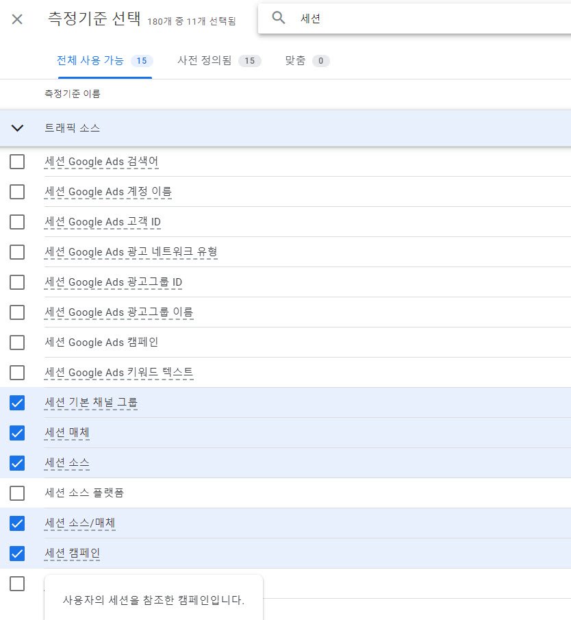 측정기준(DIMENSIONS) 역시 원하는 항목이 없을 경우 추가할 수 있습니다. 측정기준 영역 우측 상단 '+' 버튼을 클릭하면 측정기준 검색창이 노출되면서 검색을 한 뒤 추가하려는 항목의 체크박스에 체크를 하면 됩니다. 그리고 우측 상단에 있는 '가져오기(Import)' 버튼을 클릭하면 측정기준 목록에 내가 선택한 항목들이 확인될 것입니다. UA에서는 처음부터 측정기준 목록이라는 게 제공되지 않았고 무조건 원하는 측정기준을 검색하거나 목록에서 항목을 선택해야 했는데 이런 부분이 약간 바뀐 점이라고 이해하시면 됩니다. 기본적으로 존재했으면 하는 측정기준이 기본 목록에 보이지 않는 부분은 살짝 아쉬움이 남습니다. 측정기준 검색 시 특정 항목에 마우스 포인터를 올리면 측정기준에 대한 설명이 뜹니다. 이해가 되지 않은 항목이 있다면 의미를 파악하시거나 구글 도움말로 검색을 해서 항목을 추가하시기 바랍니다. 이는 지표에 해당하는 측정항목(METRICS)에도 동일하게 적용됩니다.