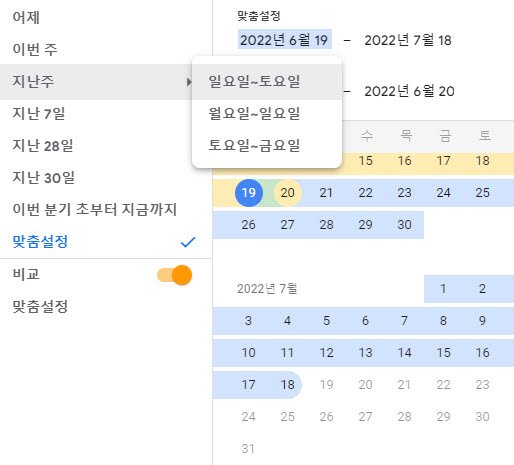 데이터를 조회하는 기간을 선택하기 위해 보고서 하단에 있는 날짜를 클릭해보겠습니다. UA와 비교했을 때 더 많은 옵션을 제공합니다. 이를테면 지난주 옵션에는 하위 옵션 값으로 요일 범위를 선택할 수 있습니다. 비비교 토글을 활성화하면 조회한 기간의 이전 기간에 해당하는 날짜와 데이터의 증감을 비교하거나 원하는 날짜를 지정해서 데이터를 비교하는 것도 가능합니다.