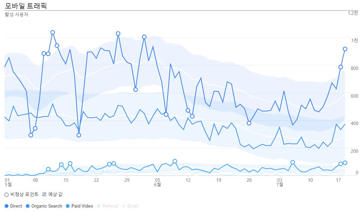 아래 그림을 보시면 채널별 활성 사용자 일별 추이 선이 보이고, 예상 값에서 벗어났을 때 '비정상 포인트'라는 이름으로 기존 데이터를 기준으로 패턴이 다른 부분을 짚어주고 있습니다. 현재 3개의 채널이 선택되었지만 다른 채널도 같이 보고 싶다면 아래 채널 항목에서 클릭을 하면 추세선이 추가됩니다. 하지만 너무 많은 선이 있을 시 데이터를 구별하기 어렵기 때문에 주요 항목만 선택해서 조회하는 것을 권장드립니다. 데이터 분석은 호기심의 연속이며, 그 결과는 작은 사실의 발견이자 액션의 시발점이 됩니다.