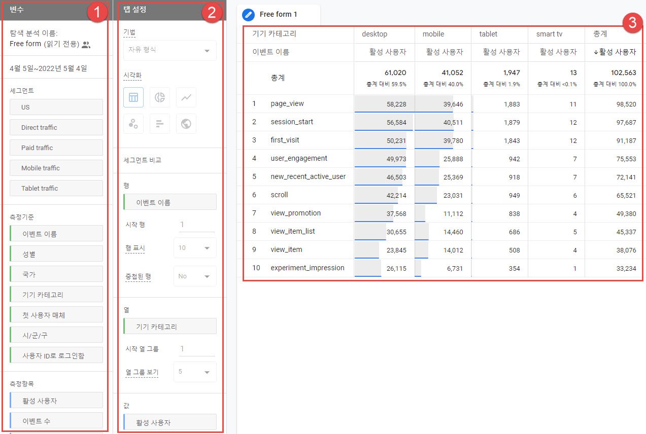 GA4에서는 보고서의 개수가 줄어든 만큼 사용자가 원하는 형태의 데이터를 조회하려면 탐색(Exploration) 메뉴에서 자유 형식(Free form) 보고서를 활용해야 합니다. 그럼 자유 형식(Free form) 보고서를 생성해보겠습니다. 말로 설명드리는 것보다 보고서가 어떤 형태로 생겼는지 보면서 말씀드릴께요. 아래 그림은 자유 형식 보고서 예시로, 좌측에는 변수와 탭 설정 섹션이 있고 우측에는 좌측에서 선택한 조건이 반영된 데이터가 조회되고 있습니다. 기기별 어떤 이벤트가 얼마나 많은 사용자로부터 발생했는지를 조회하는 케이스네요.
