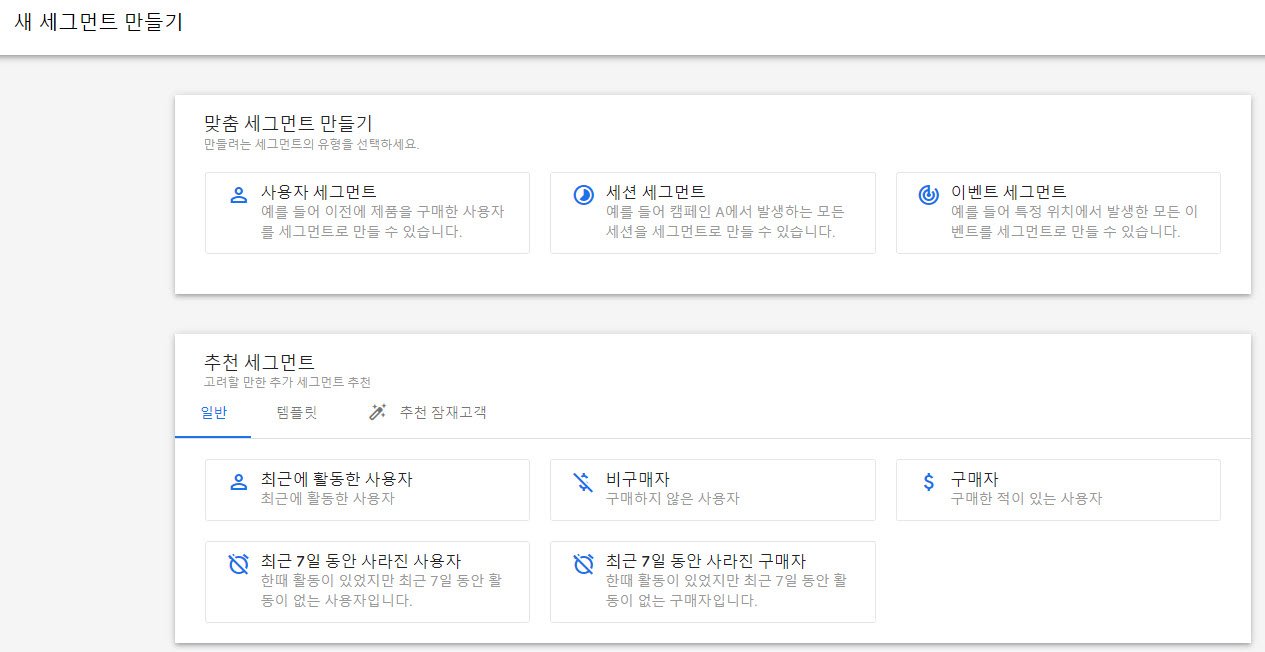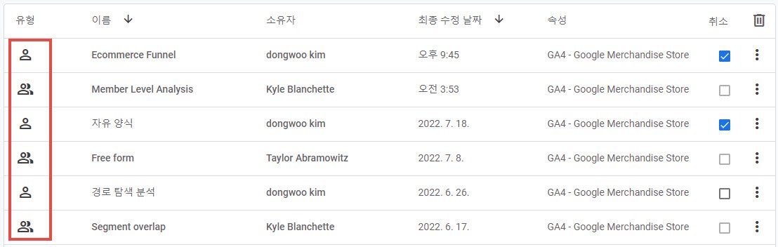 사용자 세그먼트 : 세그먼트 조회 시 선택한 조건을 만족시키는 사용자 그룹 (기존 UA 기능과 동일)