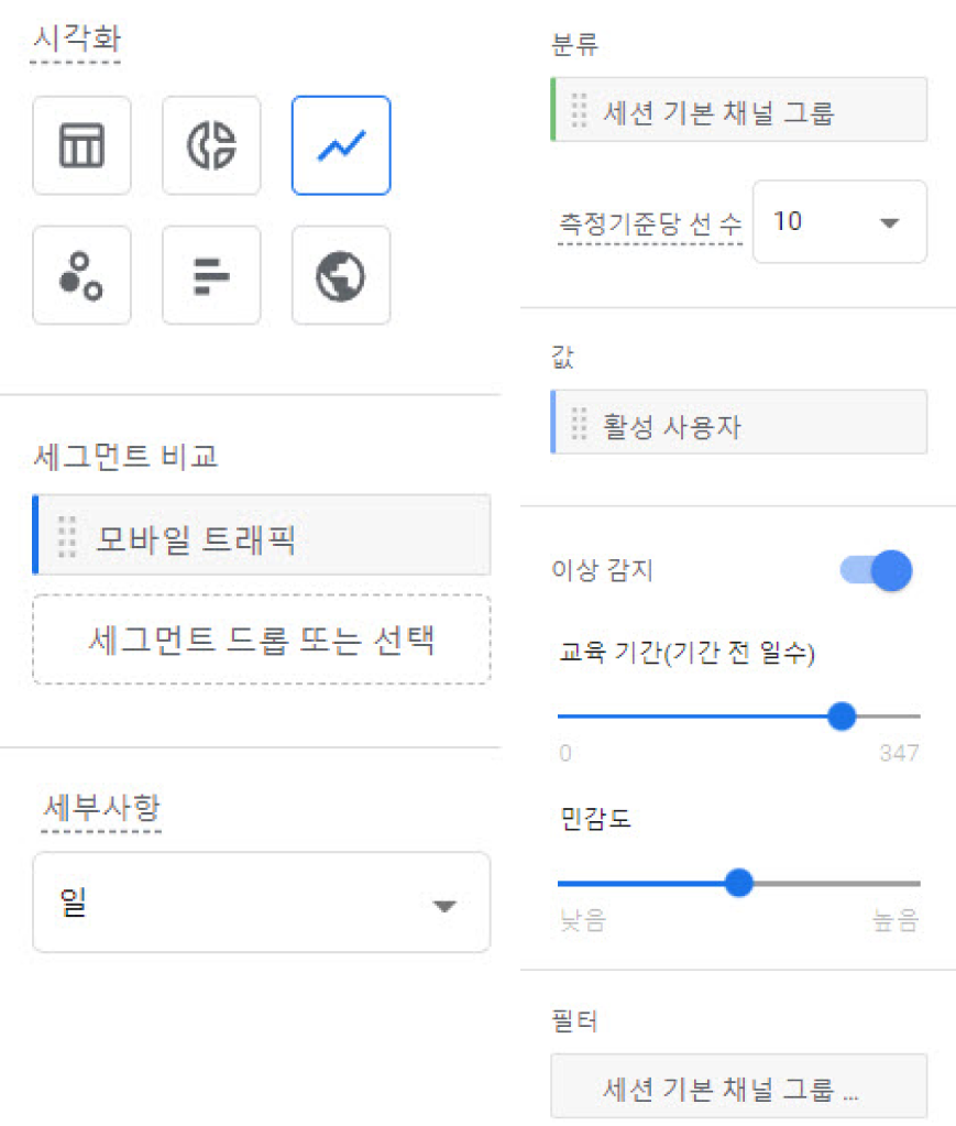 탭 설정은 기본적으로 선택된 측정항목과 측정기준, 그리고 세그먼트에 의해 보고서가 어떻게 보이는지를 세팅한다고 생각하시면 됩니다. 데이터를 엑셀과 같은 테이블 형태로 보여줄지 아니면 그래프 형태로 보여줄지를 탭 설정에서 결정합니다. 아래 그림은 '선 차트' 시각화 유형을 선택하고 모바일 트래픽 세그먼트가 적용된 일별 세션 기본 채널 그룹의 활성 사용자수 데이터입니다. 다른 항목은 전부 익숙한 이름인데 '이상 감지'라는 항목이 낯설게 느껴집니다. 이상 감지 영역을 보면 교육 기간(기간 전 일수) 및 민감도를 다시 선택할 수 있는데요.