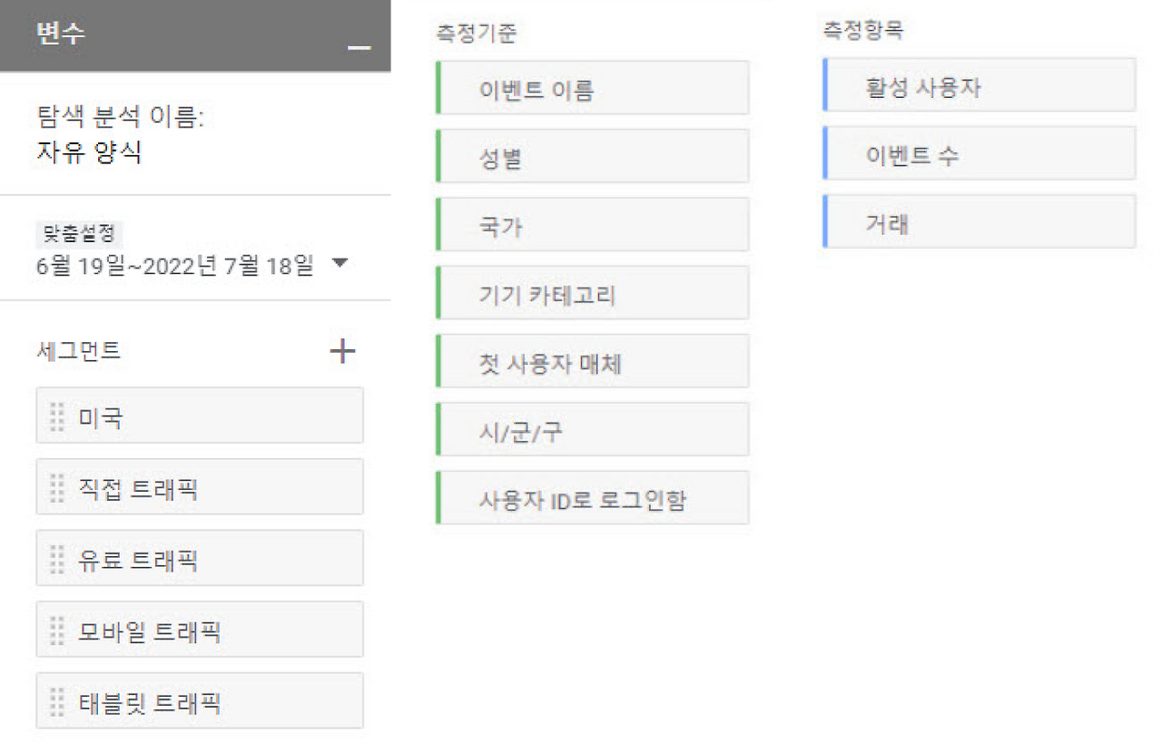 변수에서는 보고서의 이름을 정의할 수 있고, 데이터 조회 기간을 세팅할 수 있습니다. 밑에는 세그먼트와 측정기준, 측정항목이 존재합니다. 원하는 항목을 선택해서 탭 설정 영역으로 마우스 드래그를 해도 되지만, 개인적으로 판단하기로는 더블 클릭을 하는 게 훨씬 편합니다. 원하는 항목을 더블 클릭하셔서 탭 설정 영역으로 각 항목들을 옮겨지는지 확인해봅니다. 탐색 분석의 이름은 보고서 목록에서 보이므로 최대한 어떤 내용의 주제로 데이터를 조회하고 있는지 알아보기 쉽게 이름을 정합니다. 보고서 종류가 많아지고 조회하려는 보고서가 많아지다 보면 이름을 제대로 지어주지 않게 될 경우 똑같은 보고서를 반복적으로 만들고 있는 상황이 연출되는 불상사가 발생하게 될 것입니다. '보고서 유형 - 보고서 주제'와 같은 형태로 이름을 지으시기 바랍니다. 경험상 그렇게 해야 보고서의 종류가 많더라도 원하는 보고서를 빠르게 선택할 수 있습니다.