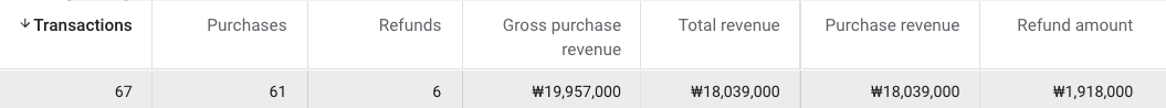 아래 데이터를 보시면 Purchases(61)+Refunds(6)의 합이 Transaction(67)으로 조회됩니다. Gross purchase revenue는 Total revenue+Refund amount가 됩니다.
