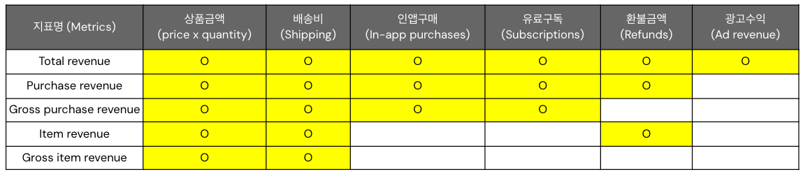 제가 GA4 도움말에 설명된 내용을 근거로 정리한 테이블입니다. 요약하면, Gross 라는 단어가 Revenue 지표에 붙으면 환불 금액이 포함되지 않구요. 반대의 경우 환불 금액이 포함됩니다. 일반적인 이커머스는 유료구독이나 광고수익이 발생하지 않으니 둘을 제외한 4개 지표 위주로 봐주시면 되겠습니다.