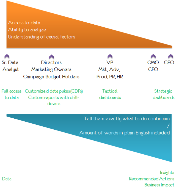 이렇게 보고를 했다면 대표는 할 말이라도 있었을 것이다. 상품을 도대체 누가 샀는지 좀 더 데이터 탐색을 해보라던지, 페이스북 광고 캠페인을 유지하면서 카피만 바꿔 본다던지, 네이버 배너 광고는 어떤 소재가 성과가 낮았는지 전체적으로 낮았는지 파악해서 추가 액션을 실행하라는 식으로 지시를 했을 것이다. A군이 위와 같이 보고를 하면서 세그먼트 단위로 추가 분석을 한다거나 다른 부서에서 어떤 이벤트가 있었는지, 숫자를 텍스트가 아닌 대시보드 형태로 보고했다면 좀 더 완성도 높은 보고서가 되었을 것이다. 그리고 가장 중요한 액션 플랜을 덧붙였다면 그는 앞으로 대표의 신임을 받을 가능성이 높다.