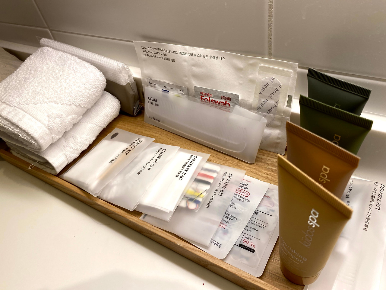 마운틴뷰라고 하기엔 너무 별로였던, 왜 네스트 호텔은 오션뷰를 추천하는지 단번에 알 수 있었다. 마운틴뷰가 아니라 철도역 뷰라고 하는 게 맞을지도. 오션뷰 객실은 침대에 누우면 바다가 보인다고 한다. 혹시나 예약하실 분들은 무조건 조금 비싸더라도 오션뷰를 예약하시길..^^ 어매니티는 특별한 건 없었는데 일회용 손소독제가 제공되는 게 발견한 다른 점이랄까.