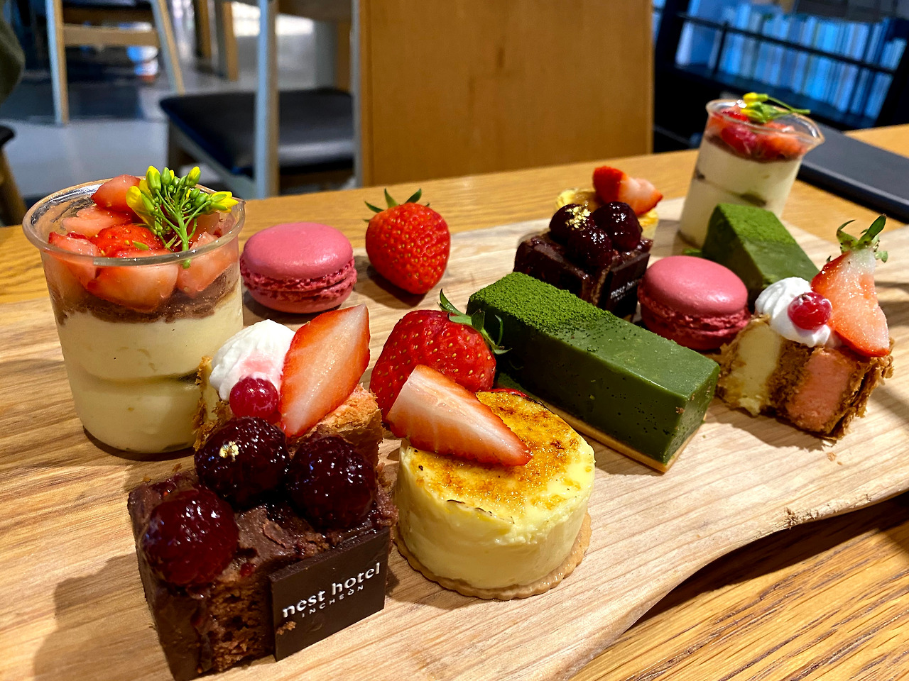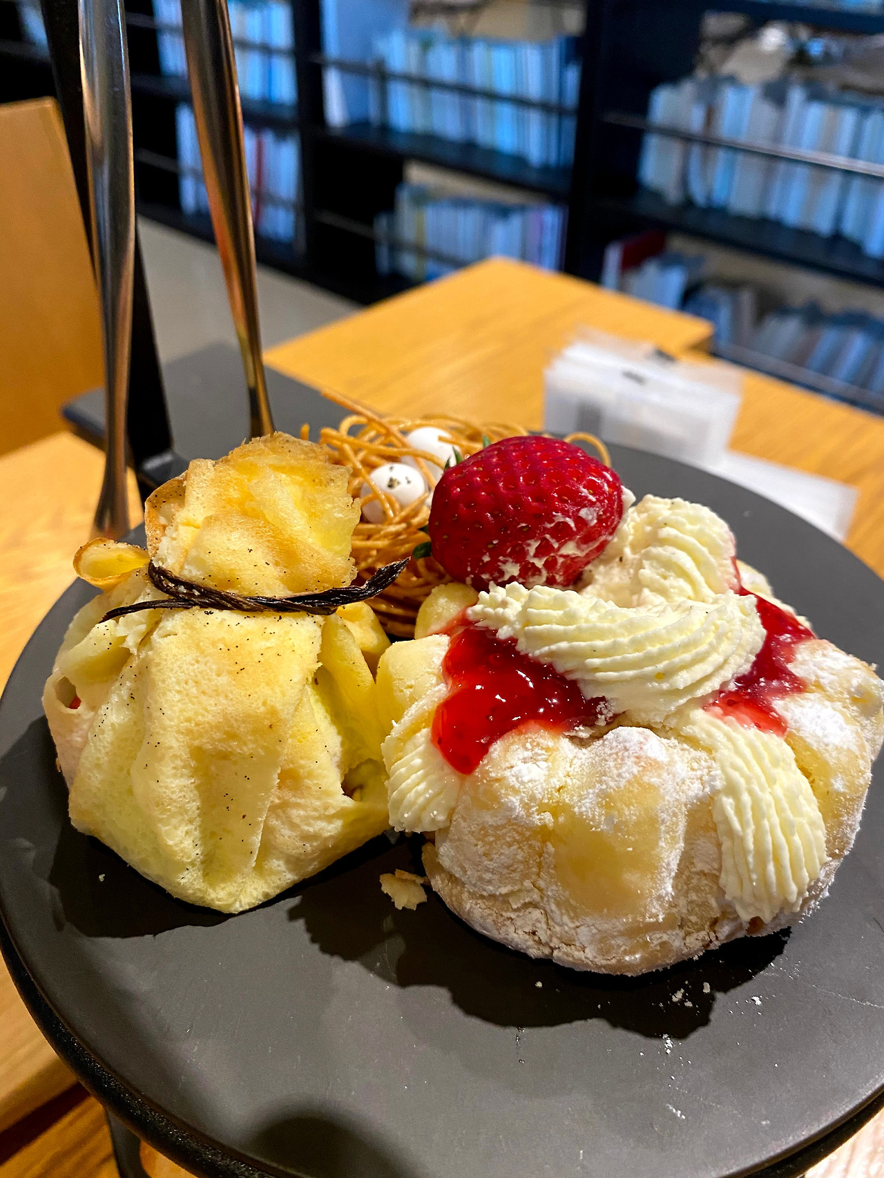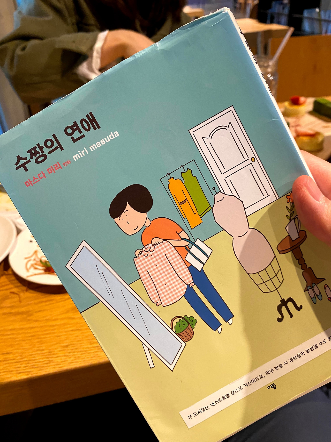 1층에는 쿤스트 라운지 바가 있다. 비도 오고 밖에 나가기 뭐해서 커피나 한잔 하려고 했는데 에프터눈 티 세트가 있길래 뭔가 해서 시켜봤다. 듣기만 들었지 사실 한 번에 안 먹어봐서 가격이 좀 나갔지만 경험해보고 싶었다. 둘이서 도저히 다 먹을 수 없는 디저트가 한가득 나오는데 2~3개 먹고 나머지는 포장했다. 그래도 오랜만에 나와서 데이트하니 기분이 좋았다. 와이프도 매일 육아로 고생하는데 너무 좋다고 하니까 나까지 흐뭇해졌다. 책 종류가 꽤 많다. 예술 서적이 많다고 하는데 혼자 사는 분들은 여유롭게 와서 독서를 하는 것도 괜찮을 듯싶다. 수짱의 연애라는 만화책을 발견해서 끝까지 다 보고 싶었는데 아쉽게도 다 읽진 못했다.