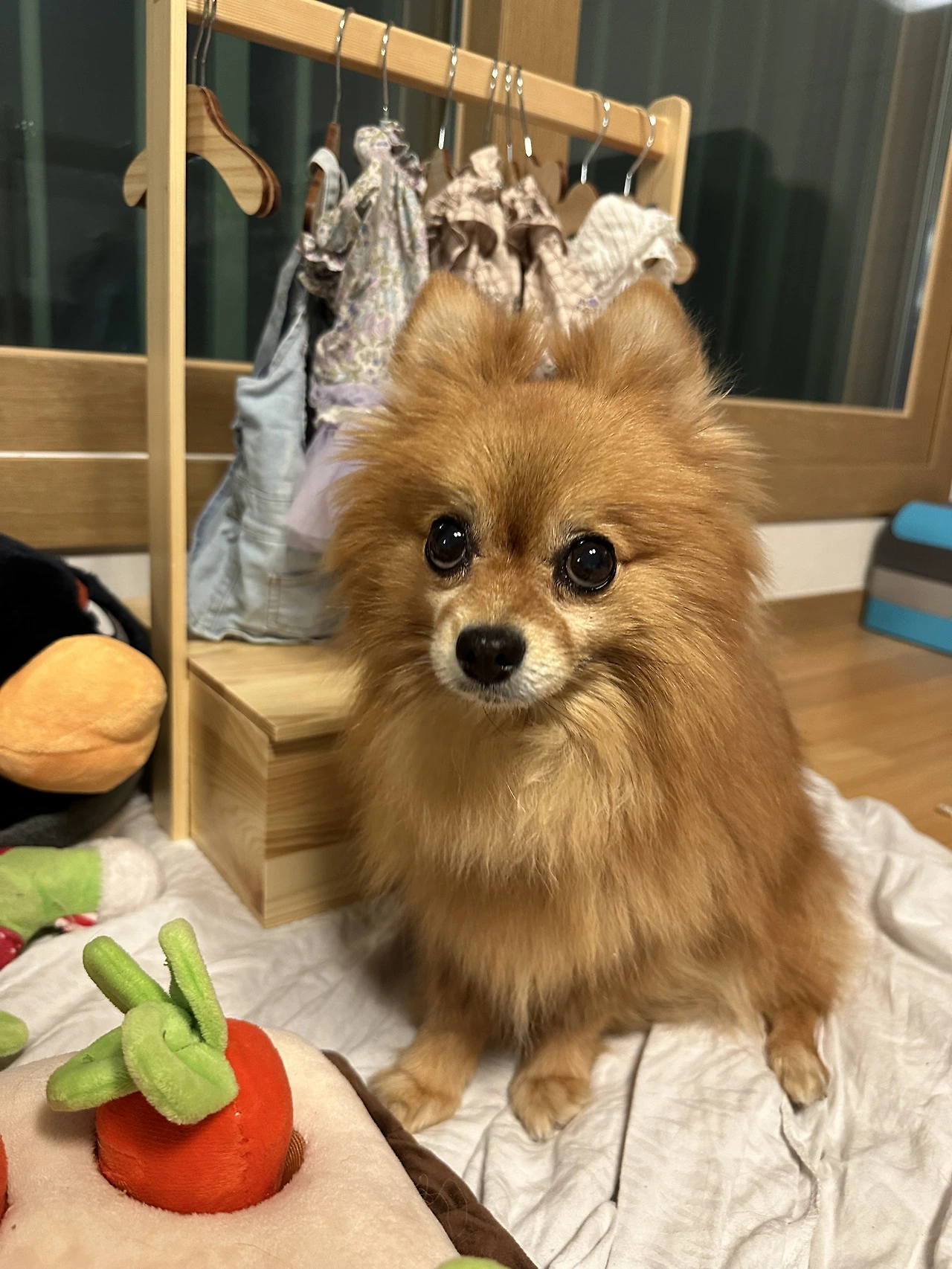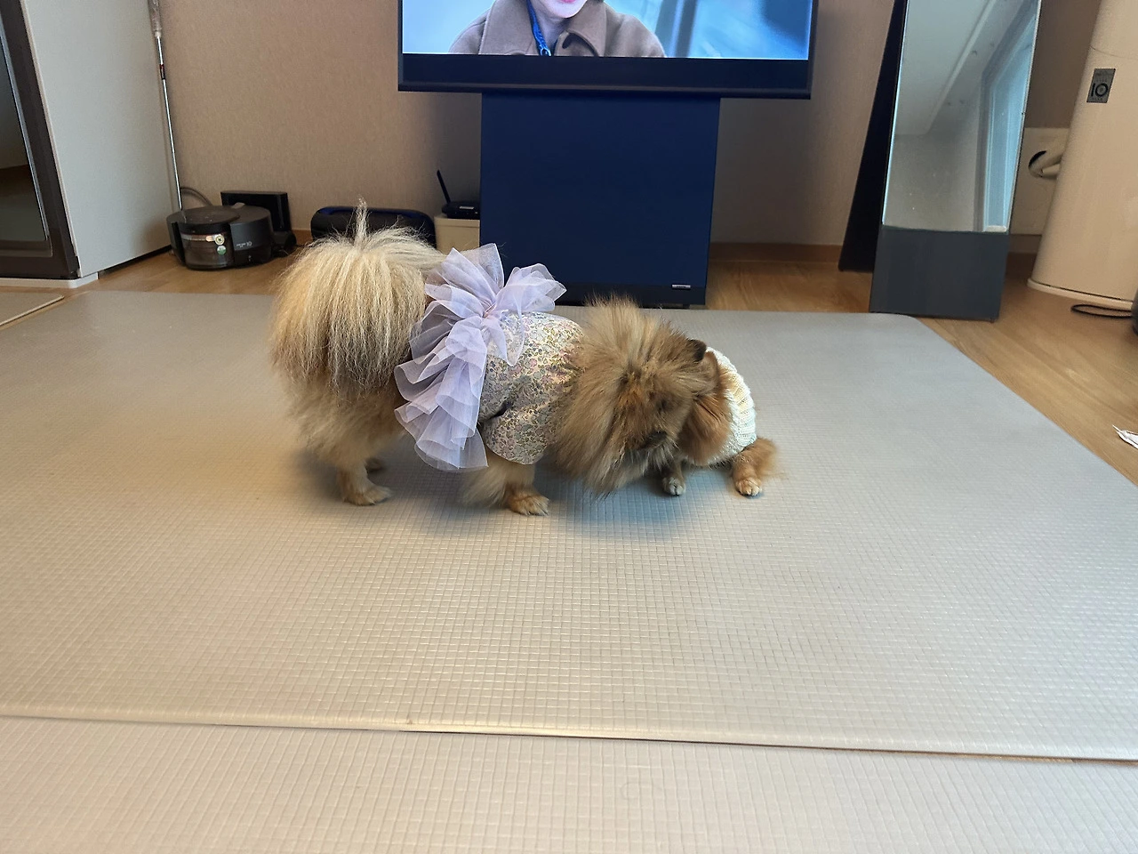 부산 병원에 입원한 후 새벽이 상태는 빠르게 회복되었다. 나는 미르와 근처 숙소에서 머물며 매일 병원에 면회를 갔는데 그때 내가 벗어준 옷이 너무 좋았는지 그 위에 누워 있는 모습이다.