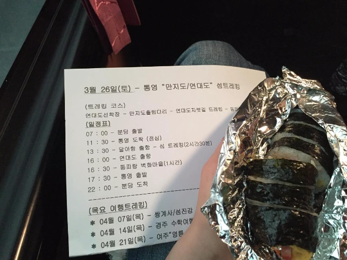 버스가 출발하면 일정표와 김밥 1줄과 생수 1병을 준다.